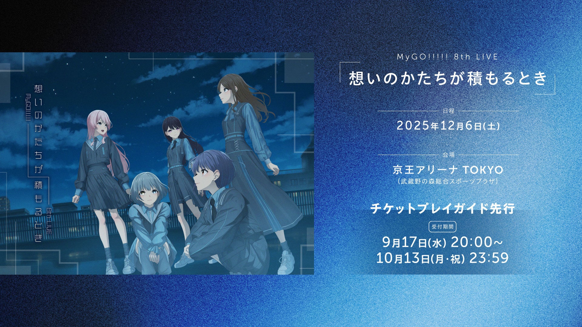 https://prcdn.freetls.fastly.net/release_image/14827/9005/14827-9005-abfb85d0afea00d3edb590bb10782b02-1920×1080.jpg Pre-sale tickets are now available through the play guide for MyGO!!!!! 8th LIVE “When the Shapes of Omoi Accumulate,” to be held at Keio Arena TOKYO on Saturday, December 6th. 【Performance Overview】 ◆Performance Title: MyGO!!!!! 8th LIVE “When the Shapes of Feelings Accumulate” ◆Date: Saturday, December 6, 2025, Doors open at 4:30 PM, Show starts at 6:00 PM (scheduled) ◆Venue: Keio Arena TOKYO (Musashino Forest Sport Plaza) Application Period: Until October 13th (Monday, National Holiday) 23:59 Application URL: