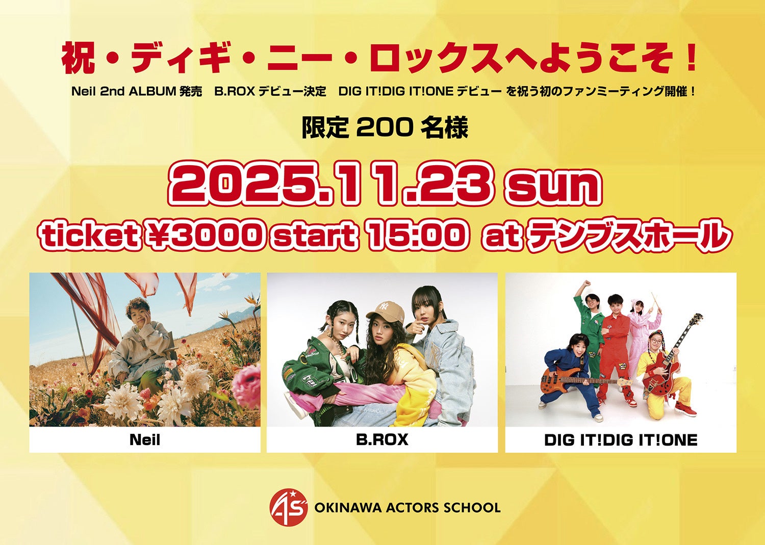 URL: https://prcdn.freetls.fastly.net/release_image/121272/15/121272-15-70e6be31a4e265f333135dd55ef19618-1280×1280.jpg B.B.WAVES B.B.WAVES is a newly debuted dance and vocal group from Okinawa Actors School, with the concept of a “youthful entertainment crew.” This unique group is made up of male and female members aged 10 to 20, including Neil, who will make his major debut in the summer of 2024.They are a creative performance group with a wide range of talents, not only in singing and dancing but also playing instruments and writing songs, and they are aiming to become global stars. ●Neil, DIG IT! DIG IT! ONE, and B.ROX will hold their first fan meeting…To celebrate the release of Neil’s second mini album, the announcement of B.ROX’s debut, and the debut of DIG IT! DIG IT! ONE, a fan meeting limited to 200 people will be held!