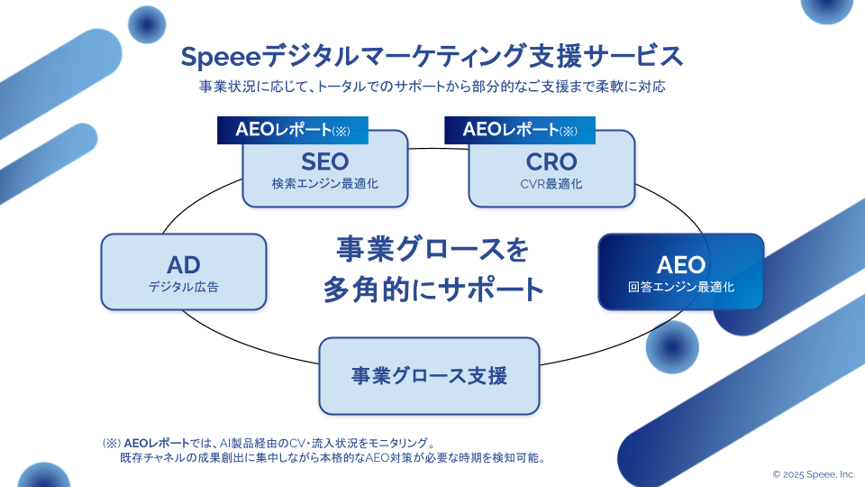 information and develop services that are useful to everyone involved in marketing, such as sharing information about AI search and expanding our AEO services. ■About Speee’s AEO (Answer Engine Optimization) Service Speee combines the data analysis capabilities it has cultivated through SEO support for over 3,000 companies with the knowledge of its AI Research & Innovation Center, the industry’s largest AI research organization, to provide AEO (Answer Engine Optimization) services.