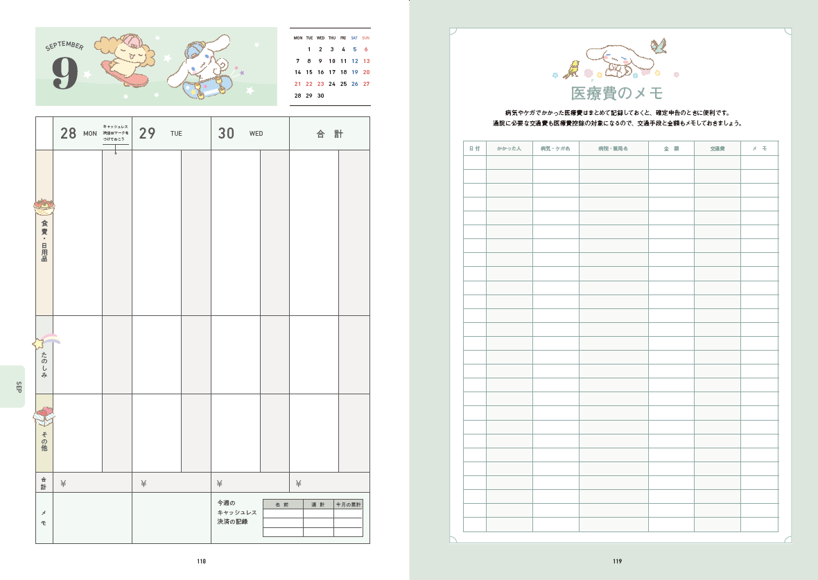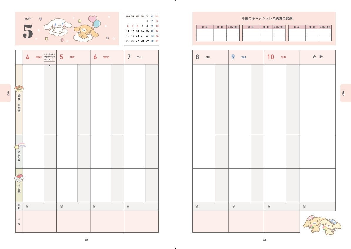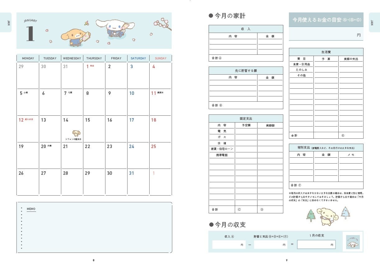 https://prcdn.freetls.fastly.net/release_image/2372/2706/2372-2706-3c1b041235885dbb0b744e82b90ce686-1222×865.jpg In addition to weekly household accounting pages, there’s also a monthly income and expenditure summary page, making it easy to manage. Simply fill out the monthly summary page to visualize your cash flow, including how much money you have available that month, and improve your financial management skills. The included monthly calendar features a cute illustration of Cinnamoroll, making schedule management a breeze. ●Cute cinnamons will cheer you up every day!