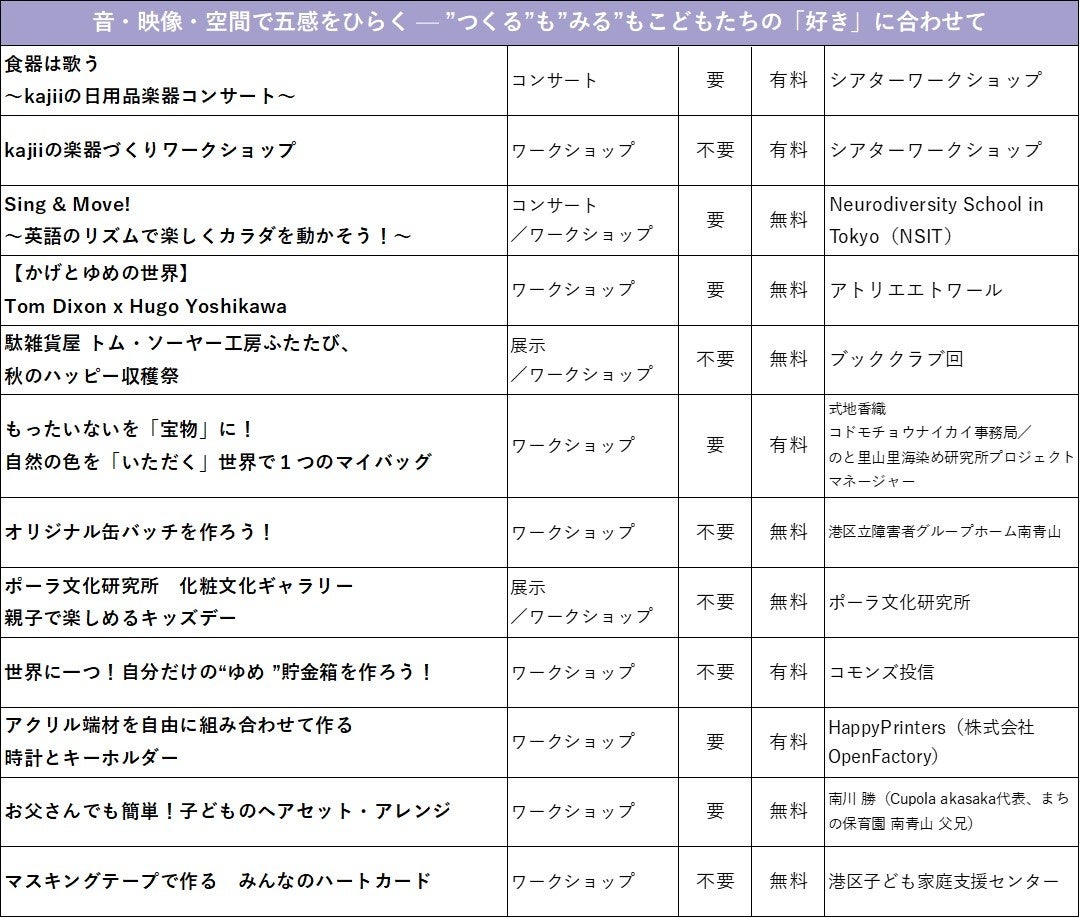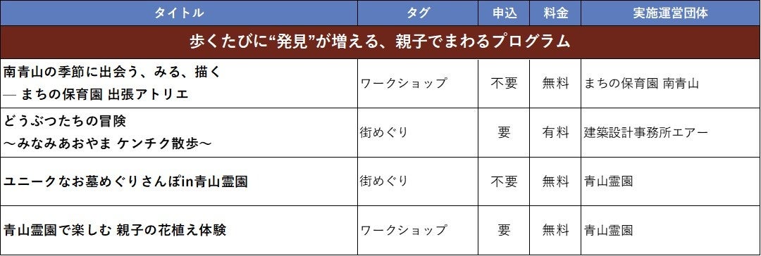 URL: https://prcdn.freetls.fastly.net/release_image/134147/15/134147-15-5bfd8b2bc59226af3ecac73ea795e4f0-2559×1098.png ■Highlights of the Minami Aoyama Children’s Art Walk ■Highlight 1: Turn the Entire Town into an Atelier—A Parent-Child Program Where You’ll Discover More with Every Walk Minami-Aoyama has plenty to see throughout the town. From the golden ginkgo trees shining in November, to the quiet lanes of Aoyama Cemetery, the facades of famous buildings, and even the fallen leaves and nuts at your feet. There are plenty of programs to help you discover the charms of this town that you might otherwise pass by without noticing, focusing on nature, historical sites, architecture, and more. ■Highlight 2: Opening the senses with sound, images, and space – “Creating” and “seeing” are tailored to children’s interests Among the sounds, images, and space, you can freely choose from a variety of experiences to listen, follow, and move your hands. From short production workshops to in-depth concerts and lectures, you can open up your five senses by moving back and forth between “making, seeing, and listening” at your own pace. ■Highlight 3: Meet the creators and learn about the process – lectures, workshops, and encounters with the real thing We also offer a wide range of programs by leading artists, as well as gallery lectures and exhibitions. This will bring you closer to the thoughts and processes “behind” the works. There will be artist talks by Enrico Isamu Oyama, who will be installing his work at the Pola Aoyama Building, SHIMURAbros, and a workshop by sponge artist Goemon Yoshikawa. The same work may look completely different after listening to the talk and then getting hands-on with it. ■ Event List (As of October 14th, more events are planned for the future)