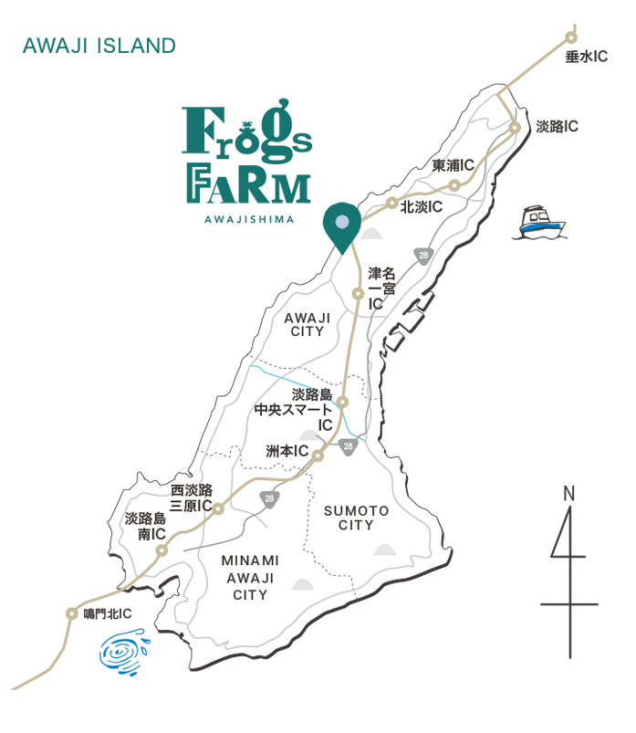 0799-85-0316 ■URL: https://frogsfarm.jp ■Parking: Free parking available (approximately 300 spaces) ■Access: [Car] From Kobe: From the Kita-Awaji IC on the Kobe Awajishima Naruto Expressway, head south on the Awaji Sunset Line. From Tokushima: From the Tsuna-Ichinomiya IC on the Kobe Awaji Naruto Expressway, head towards Ichinomiya and Prefectural Route 31. [Bus] Direct from Kobe or Sannomiya by Shinki Bus.
