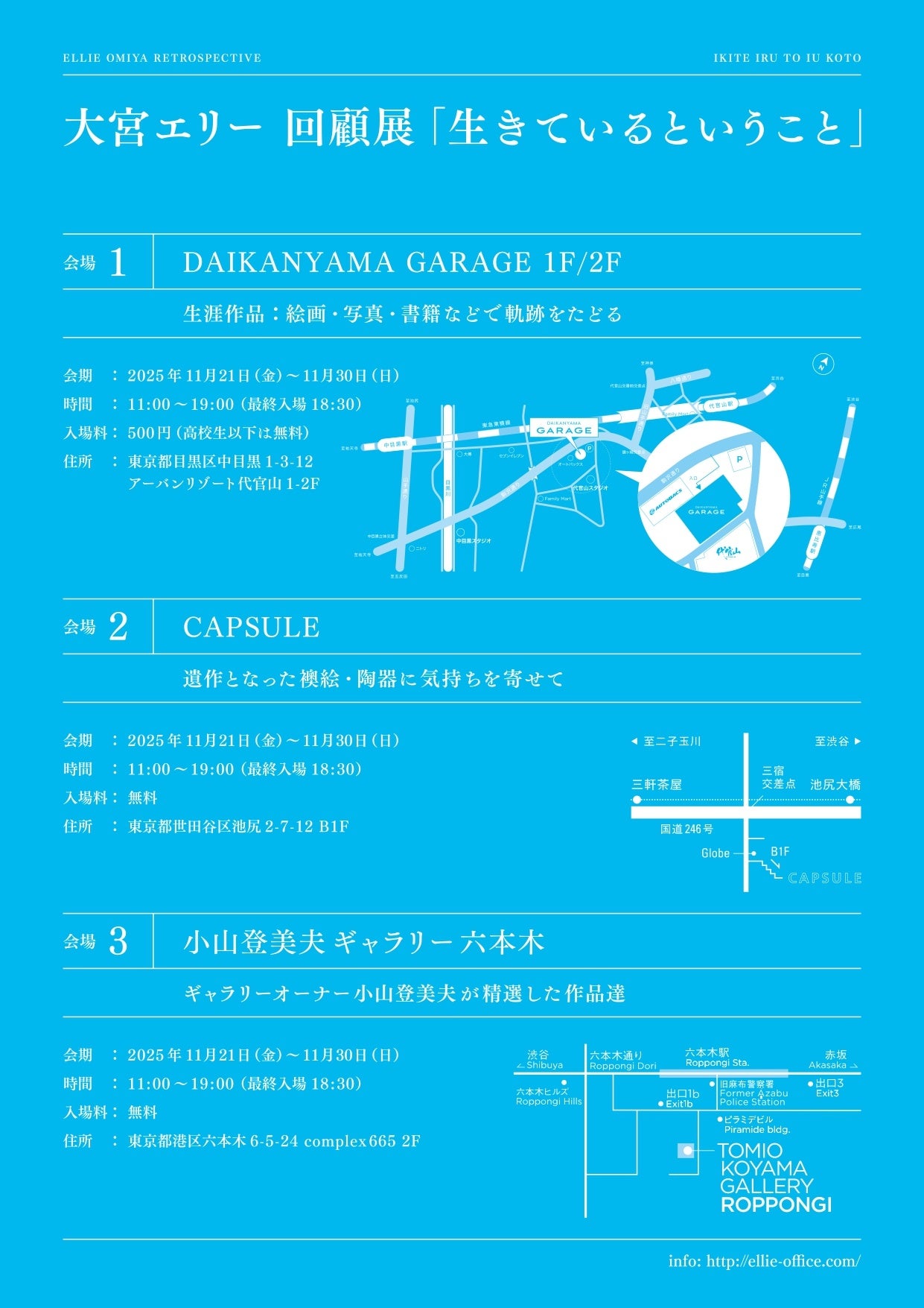 Starting November 21st, the day that Ellie Omiya would have turned 50 years old before her passing in April 2025, we are exhibiting a carefully selected selection of 1,269 works (paintings, photographs, ceramics, and books) from her lifetime. Ellie Omiya’s retrospective exhibition, “What it means to be alive,” will be held simultaneously at three galleries in Tokyo. Come and see the work of Omiya Ellie, a professional. Ellie Omiya Retrospective “What it Means to Be Alive” [Lifetime Works: Tracing His Path Through Paintings, Photographs, Books, and More] Venue 1: DAIKANYAMA GARAGE 1F/2F Dates: Friday, November 21, 2025 – Sunday, November 30, 2025 Hours: 11:00 – 19:00 (last entrance 18:30) Admission Fee: 500 yen (free for high school students and younger) Address: Urban Resort Daikanyama 1-2F, 1-3-12 Nakameguro, Meguro-ku, Tokyo