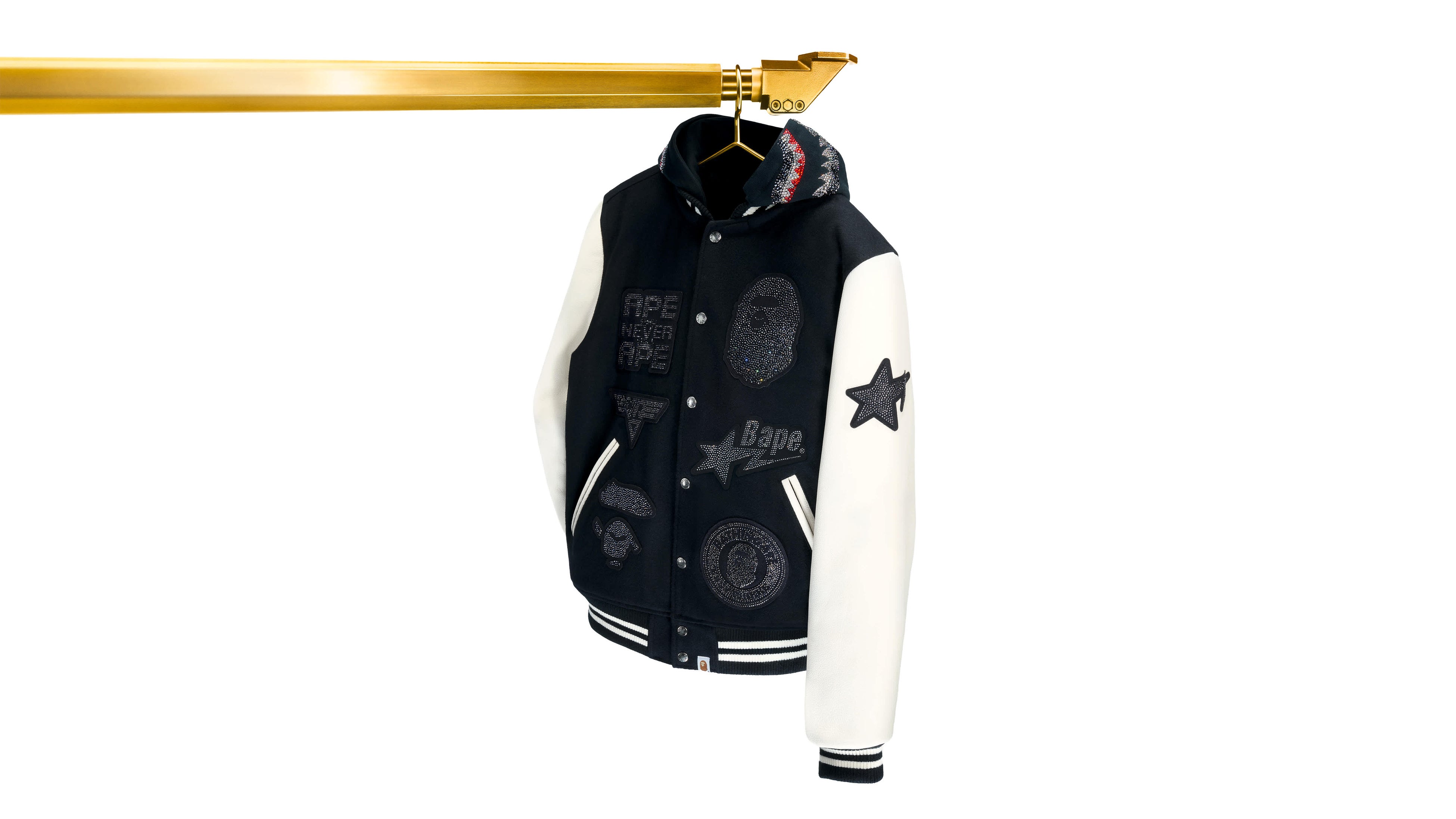 URL: https://prcdn.freetls.fastly.net/release_image/7029/116/7029-116-b40c9246cd73f01f0221cc8a94c77047-3900×2194.jpg A BATHING APE(R) A BATHING APE(R) A BATHING APE(R)’s signature varsity jacket, known for its camouflage pattern and vibrant colors, is now luxuriously enhanced with Swarovski crystals. 11,388 multicolored crystals are intricately placed, including the iconic shark logo on the detachable hood. This bold statement piece symbolizes the fusion of streetwear and craftsmanship.