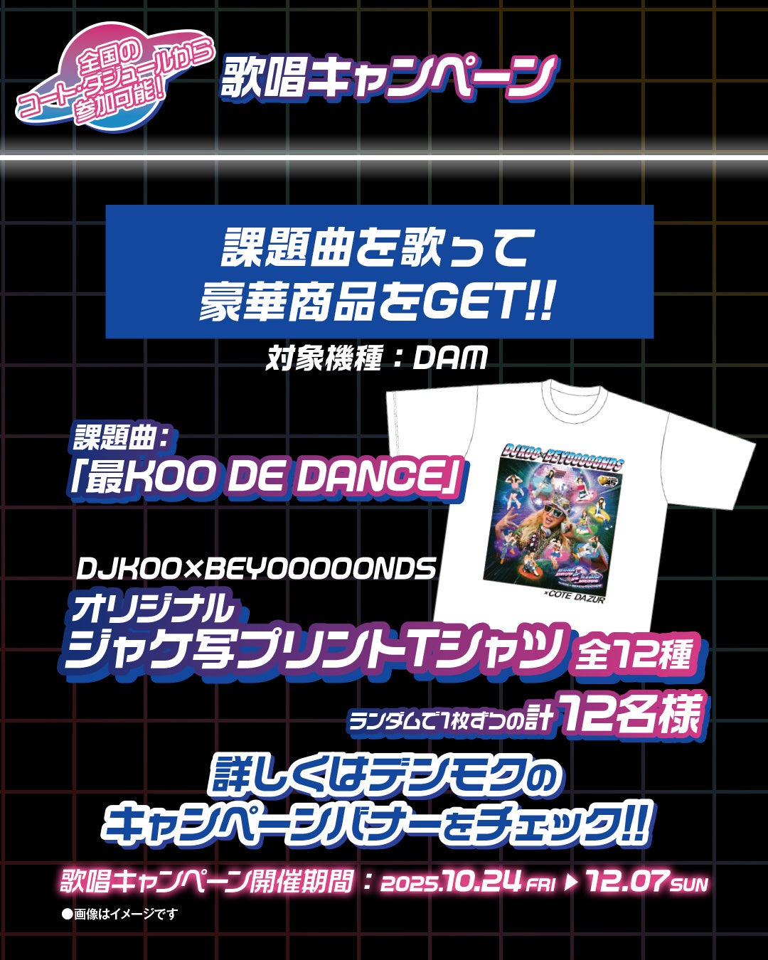 https://prcdn.freetls.fastly.net/release_image/75275/119/75275-119-419239f95a107440554c7ffcc265bf42-1080×1350.jpg ■Singing Campaign To commemorate this collaboration, a DAM singing campaign exclusive to Cote d’Azur will be held at all Cote d’Azur stores. You can participate in the singing campaign at any Cote d’Azur store nationwide. Prize: Original jacket design printed T-shirt (12 types) ※L size only / 6 white types / 6 black types Stores: All Cote d’Azur stores Period: October 24, 2025 (Friday) to December 7, 2025 (Sunday)
