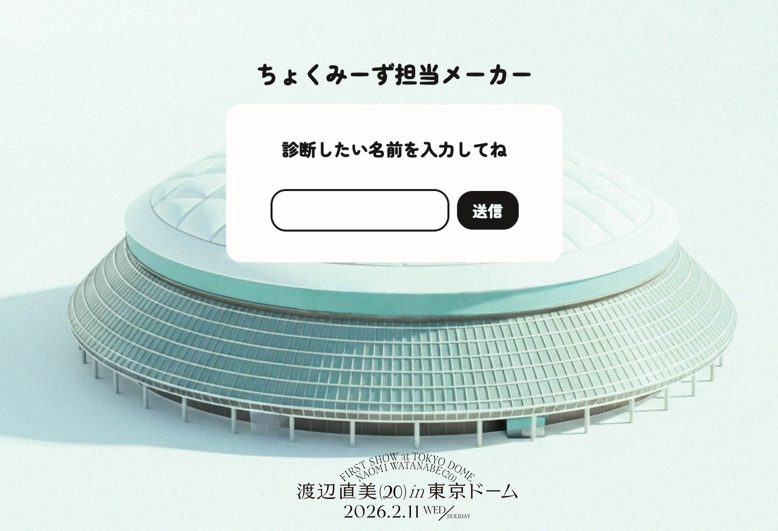 ◆HP:https://naomiwatanabe-fc.com/feature/FIRST_SHOWatTOKYODOME ◆Hashtag: #NaomiWatanabe20TokyoDome “Chokumies Role Maker” Overview Enter your name or nickname and AI will diagnose the “original role” you’ll play at the Tokyo Dome concert on Wednesday, February 11, 2026 (national holiday)! A variety of fun roles that are perfect for “Naomi Watanabe (20) at Tokyo Dome” will appear at random. ●URL: