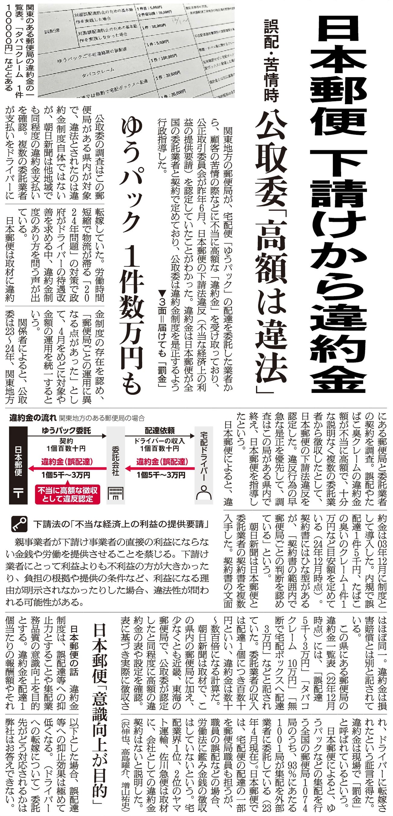 https://prcdn.freetls.fastly.net/release_image/9214/2004/9214-2004-f788cd89433461bd92bd043956bca990-1302×2700.jpg January 6, 2025, Front Page of the Morning Edition: Special Report: Japan Post’s Collection of Penalties from Contractors Determined to be Illegal by the Japan Fair Trade Commission “Investigative reporting that uncovered widespread corruption at a major public utility and contributed to its correction.” The reasons for the award announced by the Japan Newspaper Publishers & Editors Association are as follows: In its morning edition dated January 6, 2025, the Asahi Shimbun reported that Japan Post’s collection of penalties from contractors had been found illegal by the Japan Fair Trade Commission. A follow-up report revealed that the legal roll calls to check whether or not drivers had been drinking were not being properly conducted when delivering packages by vehicle. The penalty standards, which had not been improved for six months even after guidance from the Japan Fair Trade Commission, were revised following a request for coverage. Regarding the issue of improper roll calls, the Ministry of Land, Infrastructure, Transport and Tourism revoked the company’s