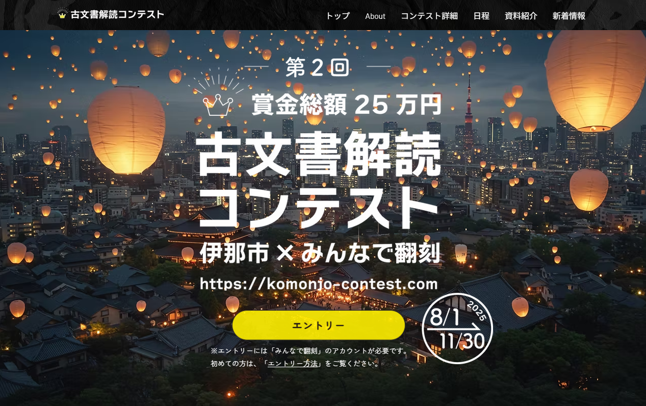 https://prcdn.freetls.fastly.net/release_image/163863/4/163863-4-dbaca32b35d4b5a22a3cc0d1facf2d3e-1214×713.png “Minna de Honkoku” modern Japanese translation display screen Achieved 840,000 characters within 2 months! Ancient Document Deciphering Contest The “Second Ancient Document Deciphering Contest,” in which fierce competition is being waged on “Minna de Honkoku,” held its interim results on October 12th, and the rankings of the top 10 contestants were announced. Two months after the start, participants have deciphered approximately 840,000 characters. Among these, many interesting documents have been discovered, including documents from when the Takato Stonemasons were commissioned to build the “Takeda Shingen’s Tomb,” which still exists today in Iwakubo Town, Kofu City, Yamanashi Prefecture, and documents from when the surveying team led by Ino Tadataka came to survey the Takato Domain. With just two months left, we can’t wait to see the final results. The Ancient Document Deciphering Contest is a contest to see who can read the most cursive characters in ancient documents within a certain period of time. Top contenders will receive a total of 250,000 yen in reward money. The contest covers ancient documents held at Takato Town Library in Ina City, Nagano Prefecture. 853 documents are currently available, including historical documents related to the “Takato Stonemasons” who were active throughout the country. This event was planned by Kazuhiro Maeda, a local revitalization volunteer from Ina City, Nagano Prefecture, and is co-hosted by Ina City, Minnade Honkoku, and AMANÉ LLC. [Ancient Document Deciphering Contest Official Website] https://komonjo-contest.com [Location of Takeda Shingen’s grave, currently located in Iwakubo-cho, Kofu City, Yamanashi Prefecture] https://maps.app.goo.gl/zPJKQypMLahGDxjr5 ■Event Overview Event Period: August 2 – November 30, 2025 Participants: Anyone aged 18 or older with an interest in ancient documents How to participate: Enter on the official website ( https://komonjo-contest.com ) Prize money: 250,000 yen total (1st place: 100,000 yen, 2nd place: 50,000 yen, 3rd place: 30,000 yen, 4th to 10th place: 10,000 yen) Date: August 2, 2025: Second Ancient Document Deciphering Contest Starts & Everyone’s Transcription Relaunch November 30, 2025: Ancient Document Deciphering Contest Period Ends Mid-December 2025: Announcement of top winners Late January 2025: Awards event (Ina City & online)