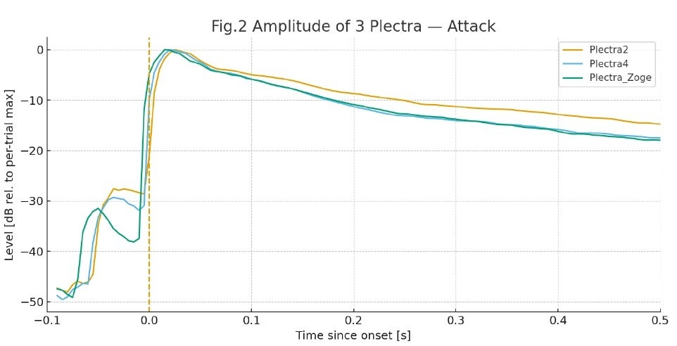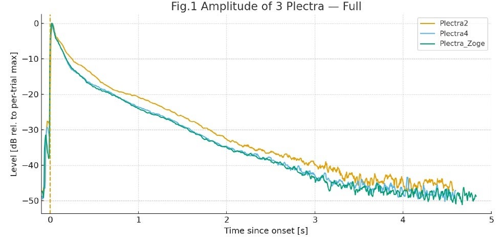 measurements of new materials Sera Creations has been working on developing ivory substitutes for Japanese musical instruments for the past eight years, and has produced numerous prototypes with the cooperation of professional performers and acoustic researchers. We have now analyzed the sound of koto nails made from cellulose nanofiber (CNF) and comparable ivory nails. The analysis was performed on the sound produced by koto plectrums made from bamboo-derived cellulose nanofiber (CNF). Below are graphs measuring the acoustics of products 2 (graph: orange) and 4 (graph: sky blue), which have different material compositions, as well as an ivory plectrum (graph: blue). From this graph, we can see that product 4 in particular has a sound that is close to that of ivory.
