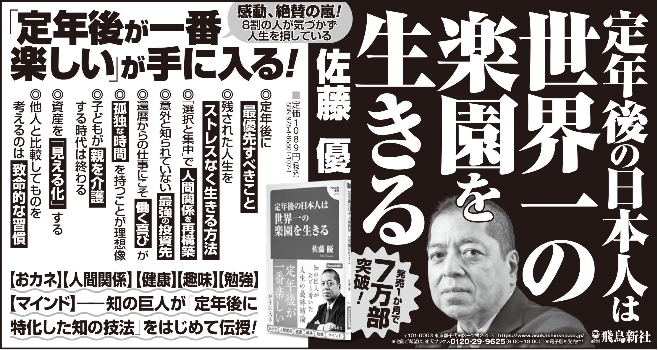 Asuka Shinsha Co., Ltd. Press release: October 15, 2025 To Members of the Press [Sold over 70,000 copies in less than a month!] The best-selling “Book on Retirement” has received an influx of emotional responses, praise, and gratitude from across the country! Intellectual Techniques Specialized for Post-Retirement, the first book written by intellectual giant Masaru Sato, has been met with a steady stream of delighted comments from readers, with comments such as “It has really changed my life after retirement” and “It has made me more positive about life.” Asuka Shinsha Co., Ltd. (Headquarters: Chiyoda-ku, Tokyo; President and CEO: Naohisa Doi) released “Post-Retirement Japanese: Living in the World’s Greatest Paradise” on September 18th. It’s been selling well in bookstores across the country, and within a month of its release, a fifth reprint was announced, quickly surpassing 70,000 copies sold. Author Masaru Sato describes this guide to life after retirement as “the culmination of my life so far.” Readers across the country have been expressing their excitement, praise, and gratitude, with comments like, “It really changed the way I live after
