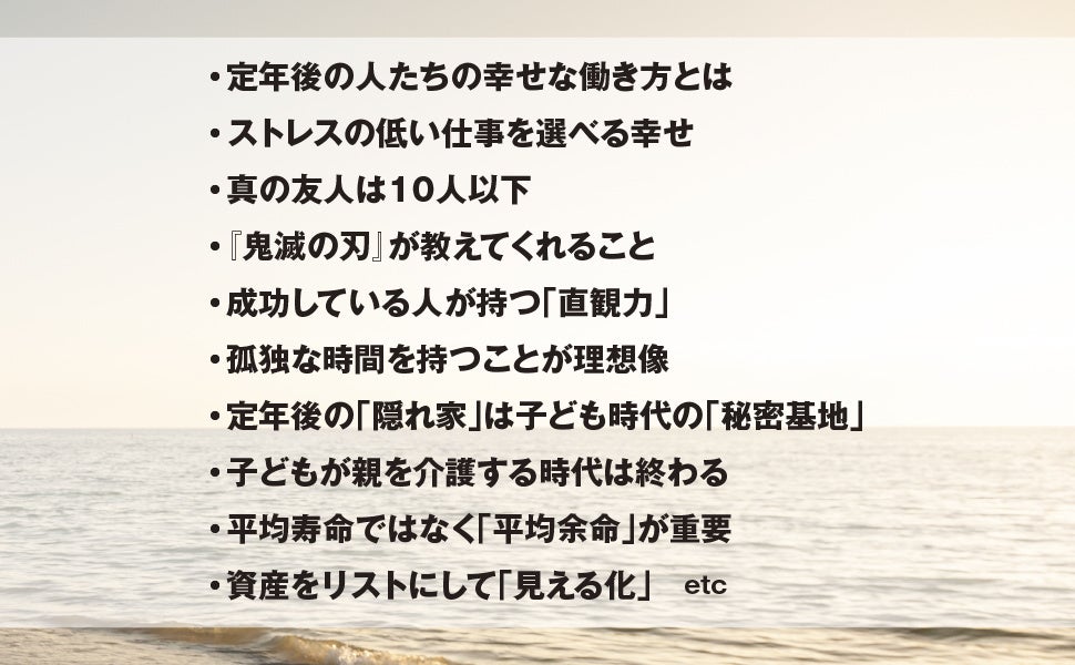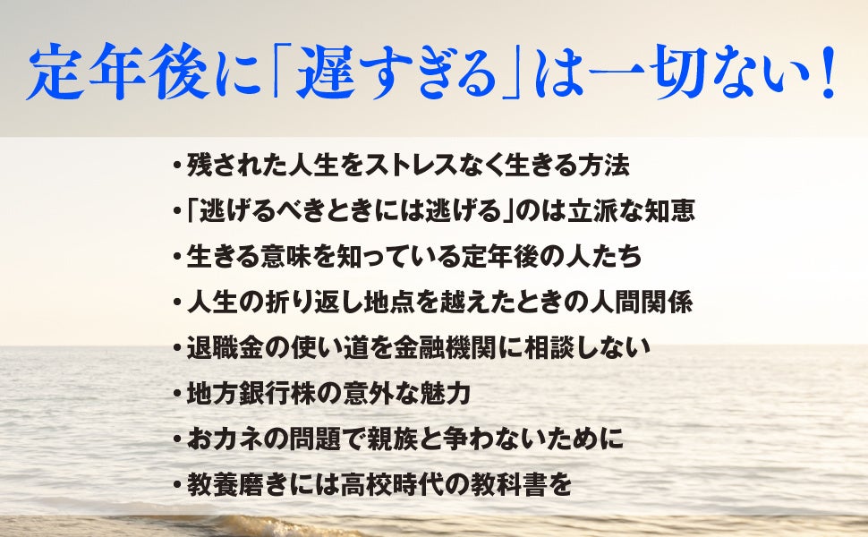 retirement!”, “It made me more positive about life!”, and “It made me feel even more truly happy.” This is the first time Sato has written about “intellectual techniques specialized for post-retirement.” He provides specific explanations of how to live and end your life after retirement, divided into eight categories. Each chapter is practical and gives readers hope. It’s truly “a book unlike any other that tells you that ‘post-retirement is the most enjoyable time, but you can still get it.'”