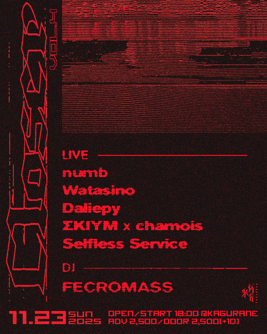 URL: https://prcdn.freetls.fastly.net/release_image/11969/1542/11969-1542-c08cf85c360cba8d82d0139654c18d7d-1080×1350.png ●Event information Sunday, November 23, 2025 Closer Vol.4 Venue: Kagurane (https://kagurane.com/) B1, TOMOS Kagurazaka Building, 6-48, Kagurazaka, Shinjuku-ku, Tokyo, 162-0825, Japan B1, TOMOS Kagurazaka Building, 6-48, Kagurazaka, Shinjuku-ku, Tokyo, 162-0825, Japan OPEN・START 18:00 ADV・DOOR 2,500 1D RA https://ja.ra.co/events/2266684 Kagura sound https://kagurane.com/schedules/view/2386 numb Watasino Daliepy ΣKIYM × chamois Selfless Service FECROMASS