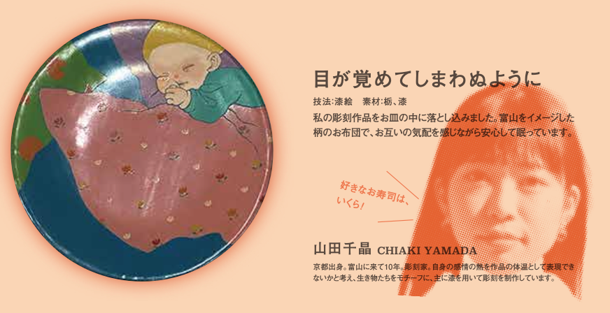 Shimonoseki-cho, Takaoka City, Toyama Prefecture) ■Admission Fee: Free ■Exhibition Contents: -Exhibition of 44 types of sushi plates created by 24 artists -Sales of trout sushi – Demonstration by Yoshinori Shimatani of Shimatani Shoryu Kobo, a craftsman who creates cases using hammering, and a workshop where you can engrave sushi “rice” and “white shrimp” patterns on a tin plate (10:00-16:30 on the 18th) Shimatani Shoryu Workshop, a craftsman who creates cases using forged metalwork. Demonstration by Yoshinori Shimatani and a workshop where you can engrave sushi rice and white shrimp patterns onto a tin plate. 【Comments】