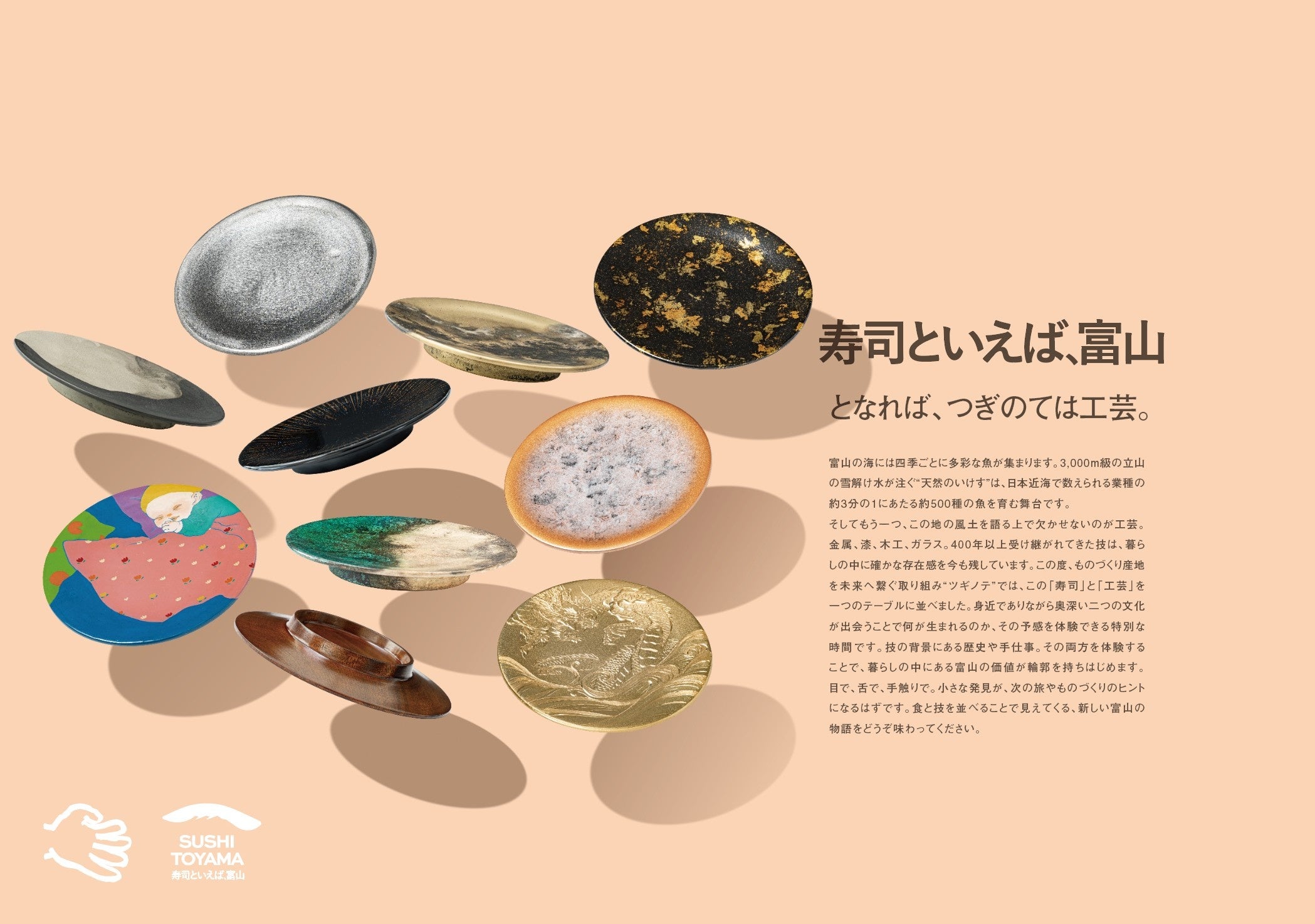 collaborative project with “Tsugino-te,” which aims to create a future for sushi-producing regions, 24 artisans and artists have created 44 types of conveyor-belt sushi plates, “Our Crafted Sushi Plates: SUSHI PLATES.” The Tsugino-te Executive Committee, based in Takaoka City, Toyama Prefecture, connects people involved in craftsmanship and engages in activities to connect craftsmanship to the future. In collaboration with Toyama Prefecture’s “Sushi: Toyama” initiative, the committee has launched a new project, “Our Crafted Sushi Plates: SUSHI PLATES,” which combines Toyama’s proud sushi culture with traditional craftsmanship. “Tsugino-te” is launching a new project called “Tsugino-te” (Sushi Plate). This time, 24 artisans and craftspeople active in Toyama Prefecture, selected by Tsuginote, have created sushi plates with a “conveyor belt sushi plate” motif. The sushi plates produced through this project will be unveiled for the first time at the Tsuginote Craft Fair, to be held in Takaoka City on October 18th and 19th. There will also be sales of trout sushi, demonstrations by metalworkers, and the opportunity to try making tin paper with rice and white shrimp patterns. Each of the 44 sushi plates features a name and background given by the artisans and artists who created them, highlighting not only the techniques used but also the story behind each plate. Also, later this year, they will be used to serve a special dish at Himi Kaiten Sushi Ikizushi in Takaoka City. This project is being carried out with support from the Agency for Cultural Affairs’ FY2025 “Cultural Resource Utilization Project Subsidy (Project to Promote the Utilization of Attractive Cultural Properties Nationwide).” [Background of the Project] A new collaboration between Toyama’s proud “food” and “crafts” When you think of sushi, you think of Toyama. And to go with it, you think of crafts.