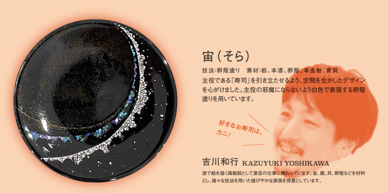 https://prcdn.freetls.fastly.net/release_image/142170/13/142170-13-f89308a4dea3831346c3412519071bf2-1242×620.png Title: Sora (Sora), Technique: Eggshell Lacquer, Materials: Japanese Chestnut, Genuine Lacquer, Overfishing, Genuine Gold Powder, and Abalone, Craftsman: Yoshikawa Kazuyuki