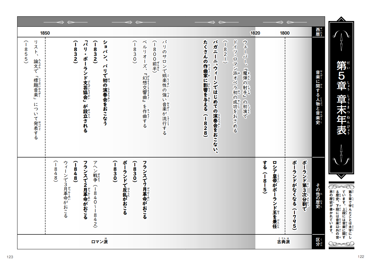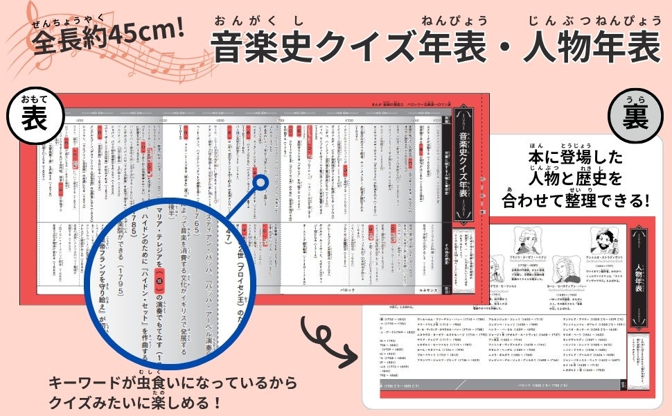 https://prcdn.freetls.fastly.net/release_image/2535/8248/2535-8248-eedec2c3b8407f158d621a8986421b33-853×1200.jpg ▲Series Volume 1: “The History of Manga Music: Ancient, Middle Ages, and Renaissance” At the end of the book is a fold-out timeline measuring approximately 45cm in length. The “Music History Quiz Timeline” on the front features missing keywords, allowing you to review the material in a quiz-like format. The “Personal Chronology” on the back introduces key figures with illustrations, allowing you to learn along with the flow of history.