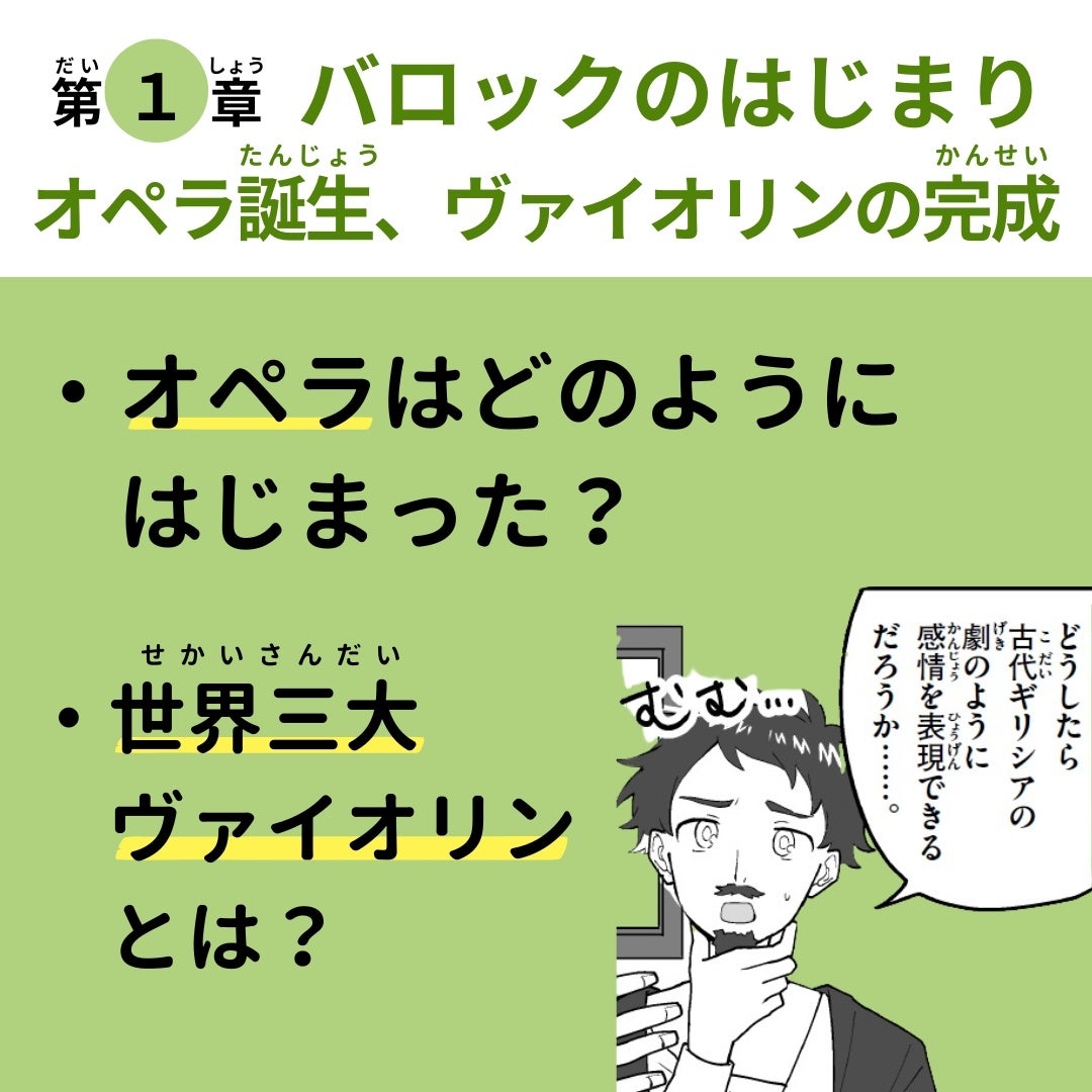https://prcdn.freetls.fastly.net/release_image/2535/8248/2535-8248-f2d2ba785f88e12e1c6bc93434fdf2f1-1228×875.png Chapter 1: The Beginnings of Baroque: The Birth of Opera, the Perfection of the Violin Chapter 2: The Maturity of Baroque: Concertos, Oratorios, and Various Musical Forms Chapter 3: The Classical Period: Court Music and Well-Formed Music Chapter 4: From Classical to Romantic: Music that Expresses the Emotions of the Common People Chapter 5: Romantic Virtuosos: The Beginning of the Piano Era Chapter 6: Romanticism during the Civil Revolution: Tradition and Innovation in German Music ●What is the “History of Manga Music” series? The “Manga Music History” series, which introduces the history of music to elementary school students in an easy-to-understand way through manga and commentary, will release its first volume, “Manga Music History: Ancient, Middle Ages to Renaissance,” in December 2024. “How did musical instruments originate and evolve?” “How has society influenced the development of music?” This three-volume series answers these questions and provides an easy-to-understand explanation of the history of music from ancient times to modern times. Volume 3 is scheduled for release in winter 2025.
