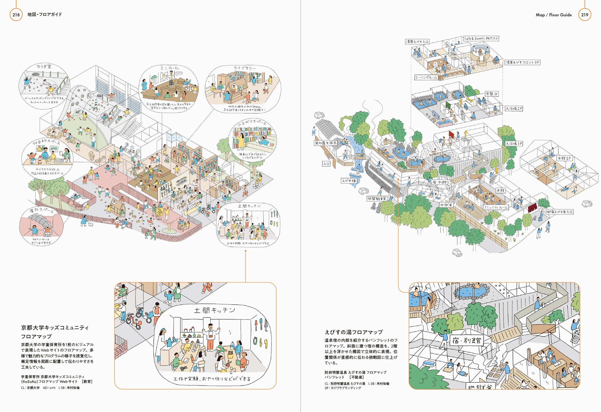 https://prcdn.freetls.fastly.net/release_image/12505/1146/12505-1146-9f406e2bc6e1178317f7111da362b3ce-2500×1714.jpg (Left) This website floor map visually depicts Kyoto University’s after-school daycare center. It visualizes the diverse and attractive programs, with supplementary information placed around it to make it easy to understand. / (Right) This floor map is from a pamphlet introducing the interior of the hot spring inn. The structure of the inn, built on a slope, is expressed in three dimensions with the second and higher floors floating. The bird’s-eye view intuitively conveys the spatial relationships.