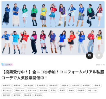 Shinchosha Co., Ltd. Press release: October 16, 2025 To Members of the Press Female junior high and high school model x Meiji Yasuda J.League!? This unusual pairing is causing a stir on X! A voting campaign is also being held on the Nicola official website! Teen magazine Nicola, now in its 28th year of publication, and the J.League, of which Meiji Yasuda is a title partner, have teamed up for an unprecedented collaboration. 22 exclusive Nicola models showcased supporter outfits combining casual clothing and uniforms. The outfits, styled with the unique sensibilities of the teen generation, have become a hot topic, especially on X (formerly Twitter).