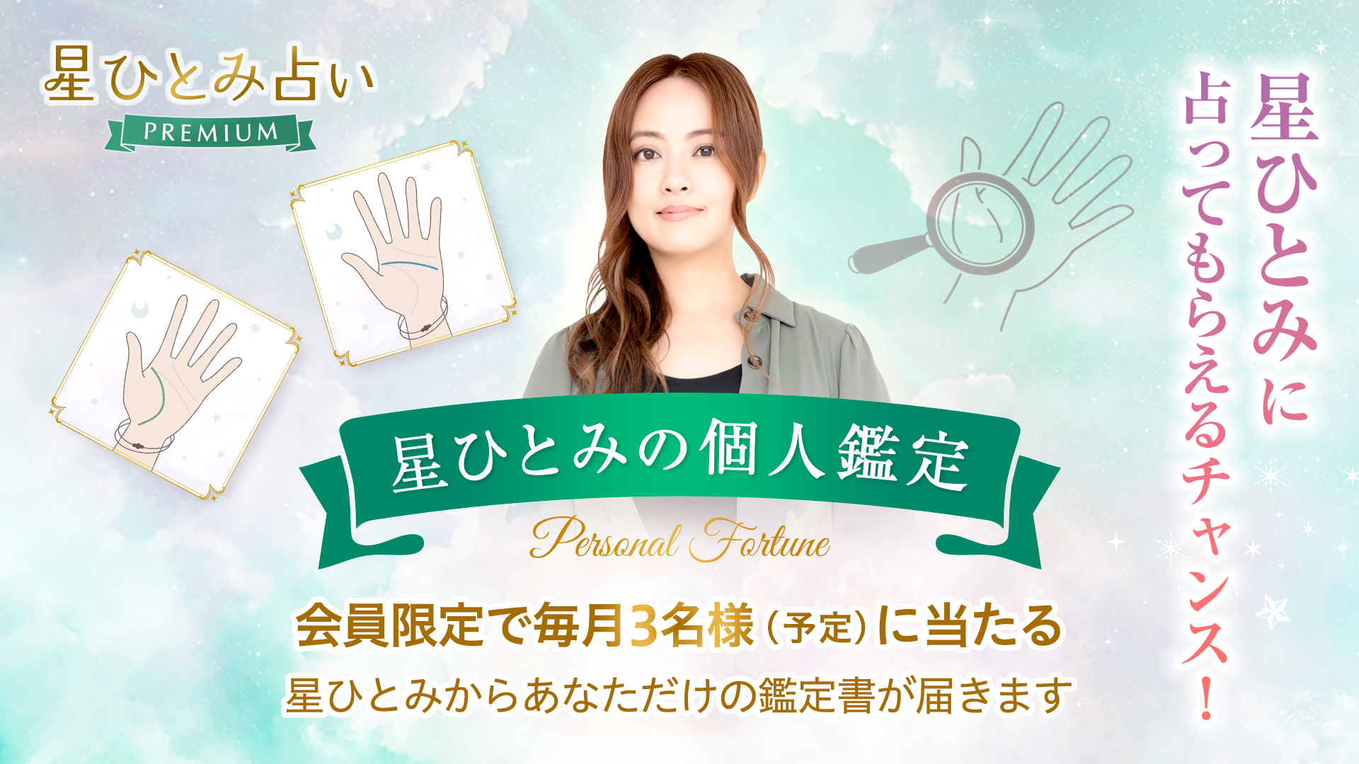 https://prcdn.freetls.fastly.net/release_image/21008/307/21008-307-b433351a4ea00a2a69414a80e8d864e3-1920×1080.png We plan to hold monthly “personal readings” in which Hoshi Hitomi will directly answer questions sent in by members. She will provide thoughtful advice through her fortune-telling on a variety of everyday concerns, including love, marriage, work, and relationships. Three lucky winners (tentatively) will be selected by lottery and will receive a special message. The details of the reading will be announced on the website at a later date. *The number of winners, dates, and details are subject to change without notice. *To apply, you will need to log in with your Google account. Thank you for your understanding. ■Release Commemoration Campaign Overview To commemorate the release of “Hoshi Hitomi Fortune Telling PREMIUM,” we are running a special campaign for new members. This great deal makes the first month’s usage fee essentially free, so be sure to take this