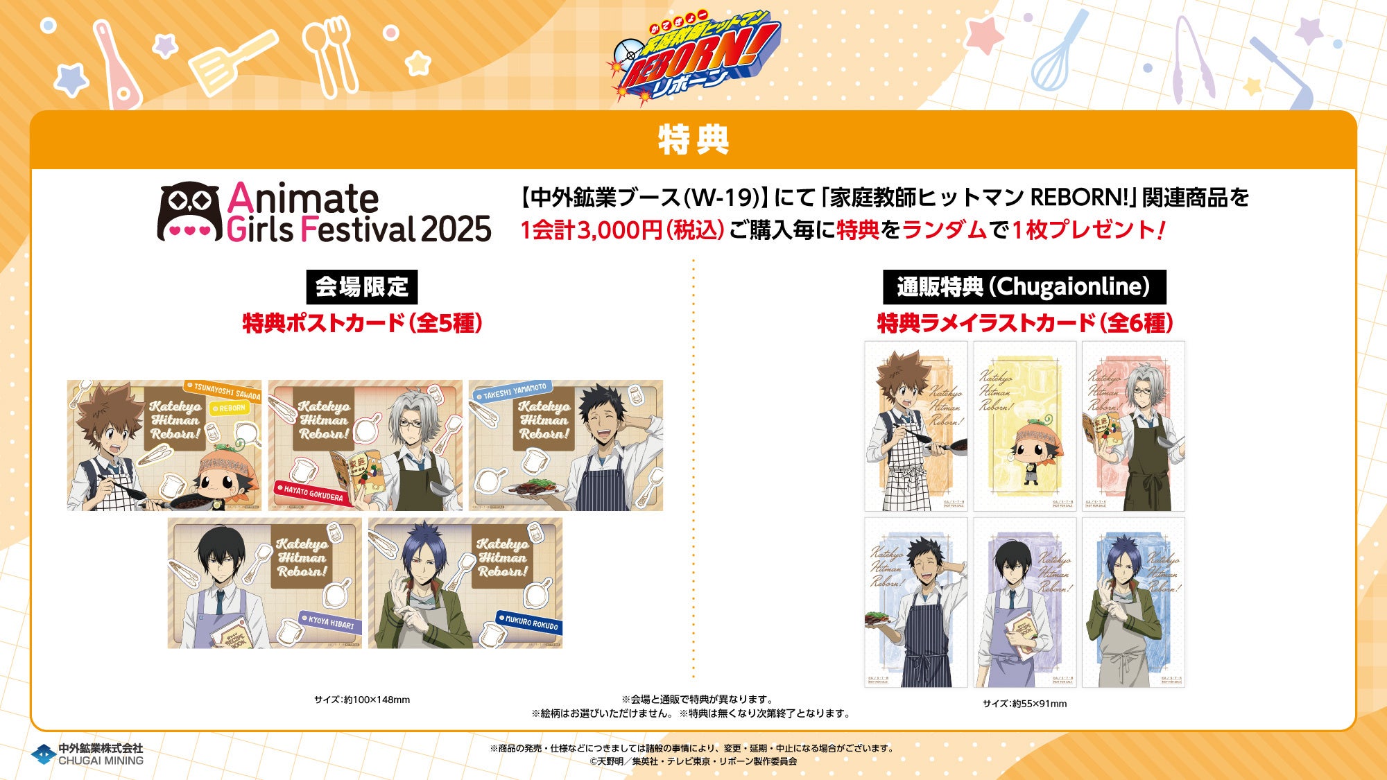 Chugai Mining Co., Ltd. Press release: October 16, 2025 To Members of the Press Merchandise featuring newly drawn illustrations with a “cooking class” theme from “Katekyo Hitman Reborn!” will be available at “AGF2025”! Advance sales will be held at the Chugai Mining booth [W-19]! Held at Ikebukuro Sunshine City from Saturday, November 8th to Sunday, November 9th, 2025