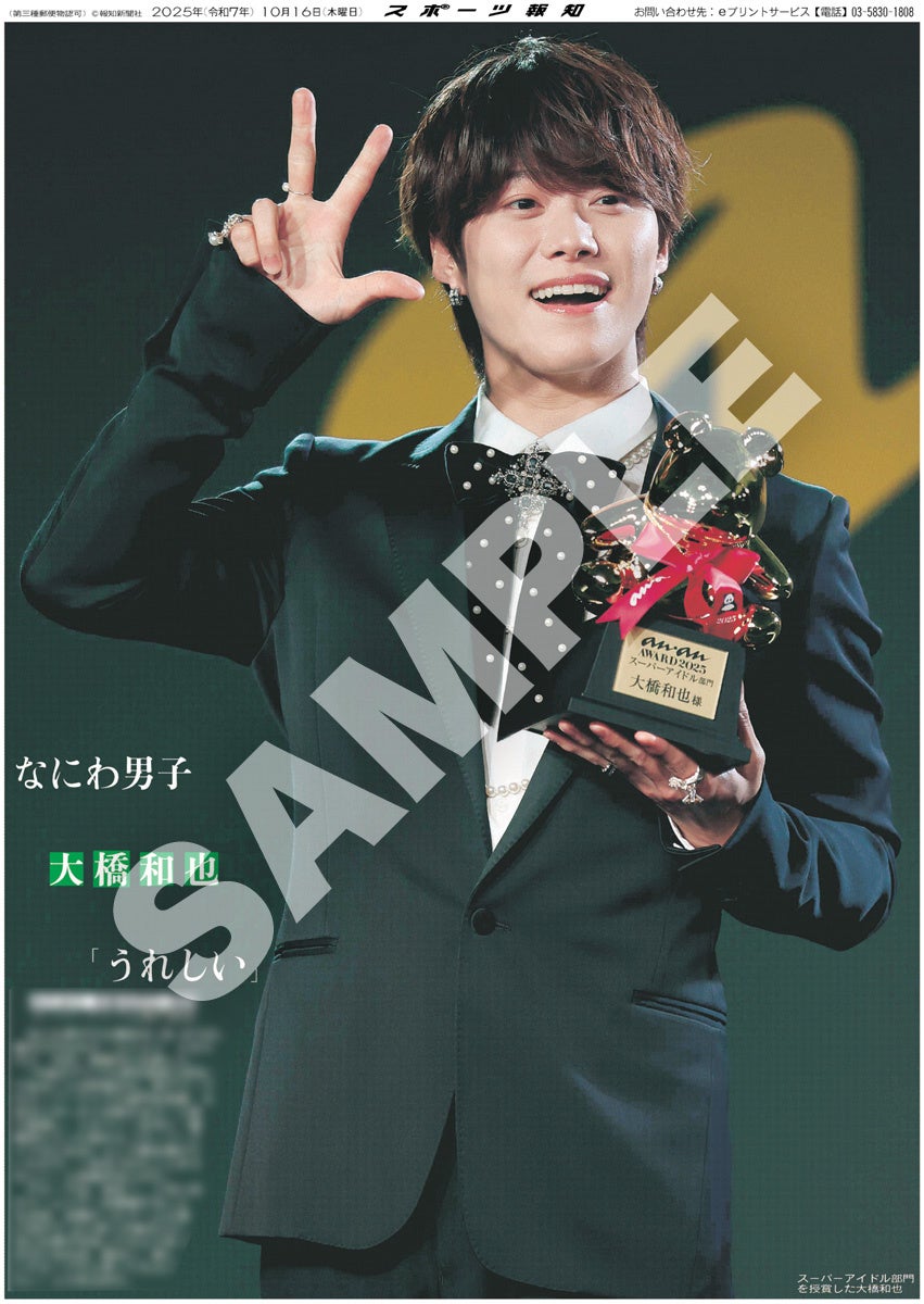 Hochi Shimbun (President and CEO: Tsuyoshi Hasegawa), publisher of Sports Hochi, is currently offering a “Sports Hochi Convenience Store Print” service, which allows users to print select pages of the newspaper from convenience store multi-function copiers. The service offers a print version featuring large photographs unique to sports newspapers. The October 16th issue of the “an an award 2025 Awards Ceremony” is now on sale. There are two versions: the Grand Prize winner, Timelesz, and the Super Idol winner, Naniwa Danshi’s Ohashi Kazuya.