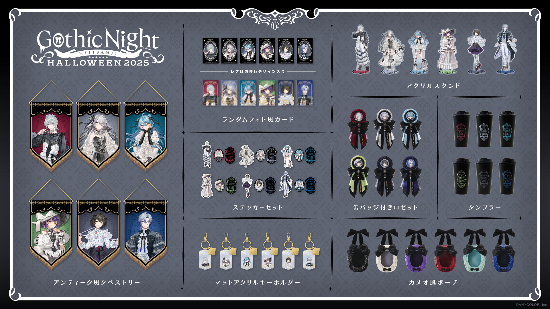 ANYCOLOR Co., Ltd. Press release: October 16, 2025 To Members of the Press Nijisanji has announced that they will be selling “Gothic Night NIJISANJI HALLOWEEN 2025” merchandise! Sales begin at 6:00 PM on Friday, October 17, 2025!