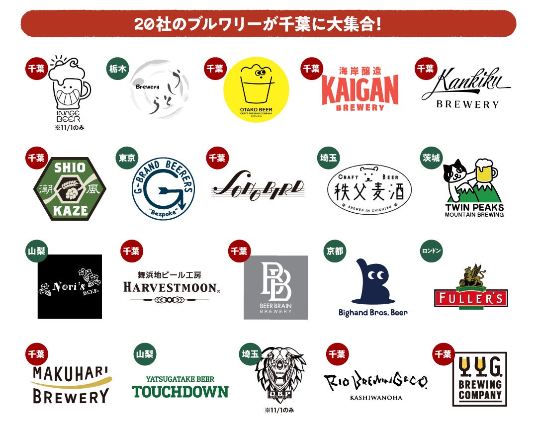 BEERERS|Tokyo ・FULLER’s (Ikon Europubs)|London ・Nori’s BEER|Yamanashi ・RIO BREWING&CO.|Chiba ・SONGBIRD (Furukawa Shoten)|Chiba ・Twin Peaks Mountain Brewing|Ibaraki ・U.B.P Brewery|Saitama (11/1 only) ・Y.Y.G Brewery Factory|Chiba