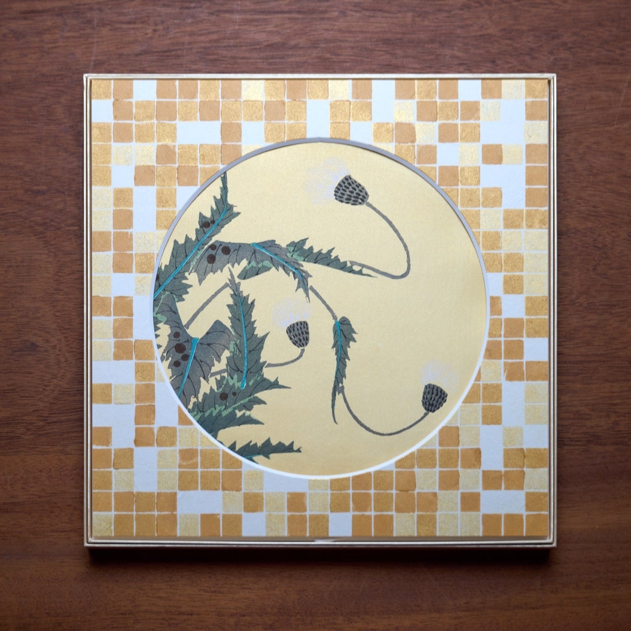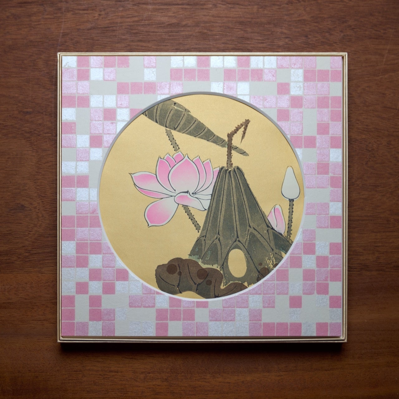 https://prcdn.freetls.fastly.net/release_image/11454/783/11454-783-19f431aa465e619408fc0c8aa3bf3057-1280×1280.jpg Ito Jakuchu “Flowers / Small iris” (woodblock print) This painting, painted by Jakuchu when he was over 80 years old, was compiled in the Meiji era by Geisodo as a colored woodblock print, “Jakuchu Gafu.” This woodblock was used to create the work, which employs traditional ukiyo-e techniques. At the request of Shueisha Manga Art Heritage, the background color for this exhibit has been printed in vibrant gold. Furthermore, noting that the circular shape is similar in size to an LP record, the work has been mounted on a matte board crafted from original Kyoto karakami paper, inspired by grid-patterned drawings. Kyoko Okazaki was born and raised in a barbershop in Shimokitazawa, Tokyo, during the postwar period of rapid economic growth. Jakuchu Ito was born and raised in a vegetable wholesaler in Nishiki-koji, Kyoto, during the mid-Edo period. Monochrome girls breathing in a square frame, and colorful flowers wriggling in a round frame. These works, spanning 200 years, are vastly different in content and style. Enjoy the something that slowly emerges from between them.