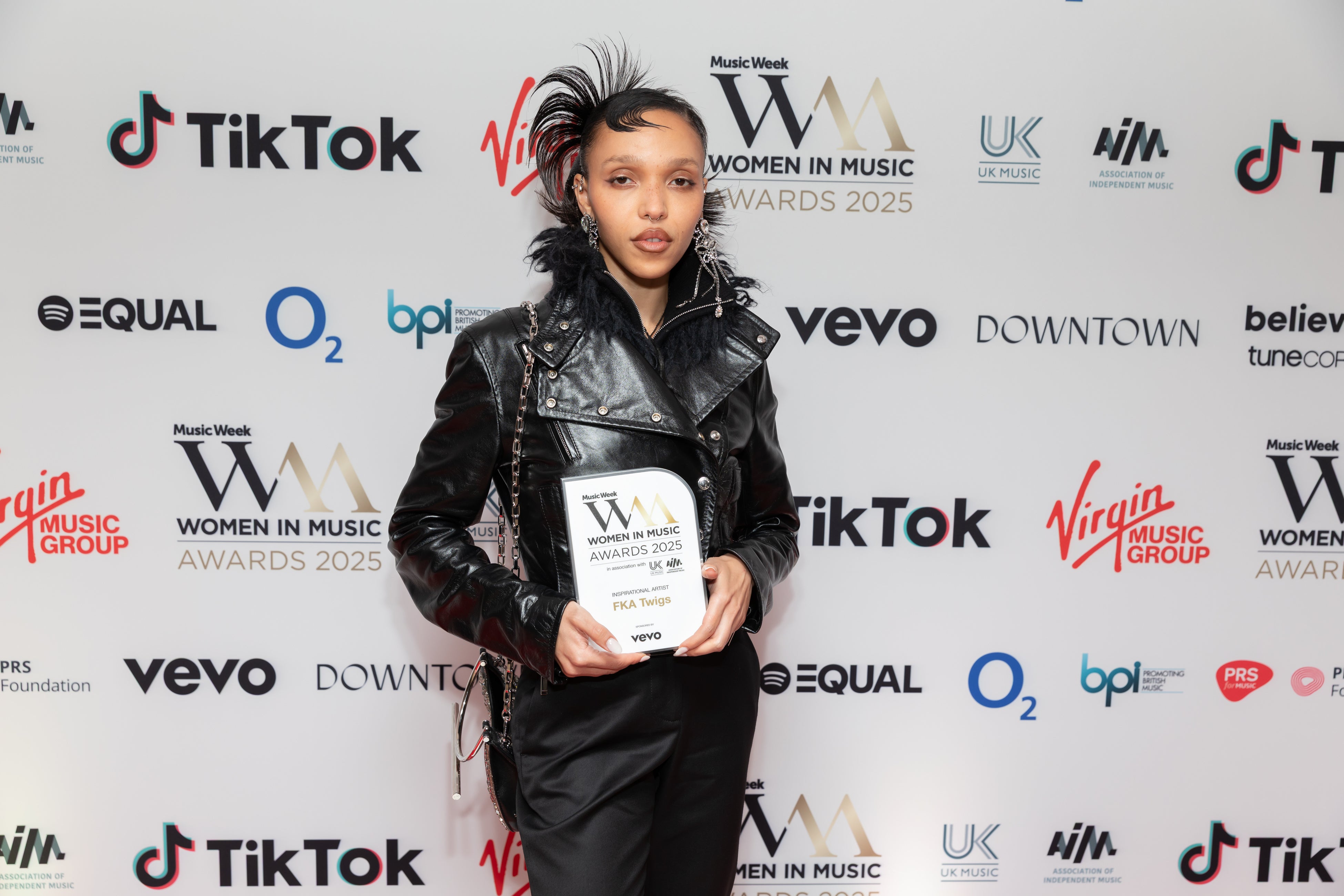 FKA Twigs appeared at the Women in Music Awards in London wearing McQueen. Paired with a black leather biker jacket, shearling collar knit, wool gabardine tailored pants, a mini T-bar bag with crystal stencil embroidery, and chandelier earrings from the Fall/Winter 2025 and Spring/Summer 2026 Pre-Collection. @AlexanderMcQueen