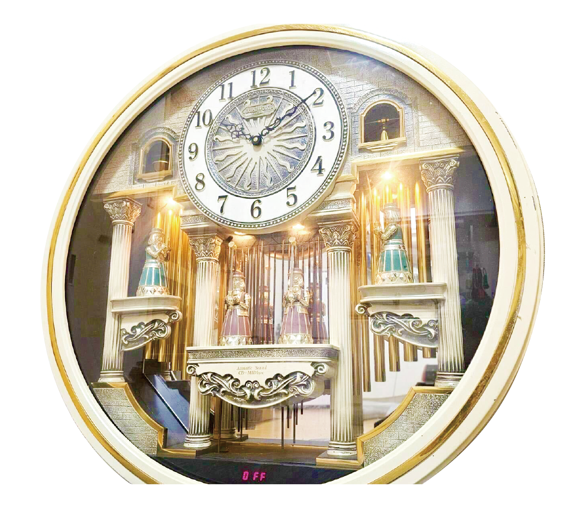 https://www.youtube.com/watch?v=AGzl7zgWTqQ Every hour on the hour, a live performance is played on a small pipe organ called a “barrel organ” built into the clock. A warm acoustic sound that cannot be produced by electronic sounds resonates. Yuya Itagaki After studying flute at a music college, he studied watch repair techniques at Hiko Mizuno Jewelry College. After graduating, he worked as a repairman at a Swiss watch manufacturer while continuing to make watches on his own. ◆Mineral Sound M606 Rhythm Co., Ltd., Private Collection, 1998 Diameter: 80 cm