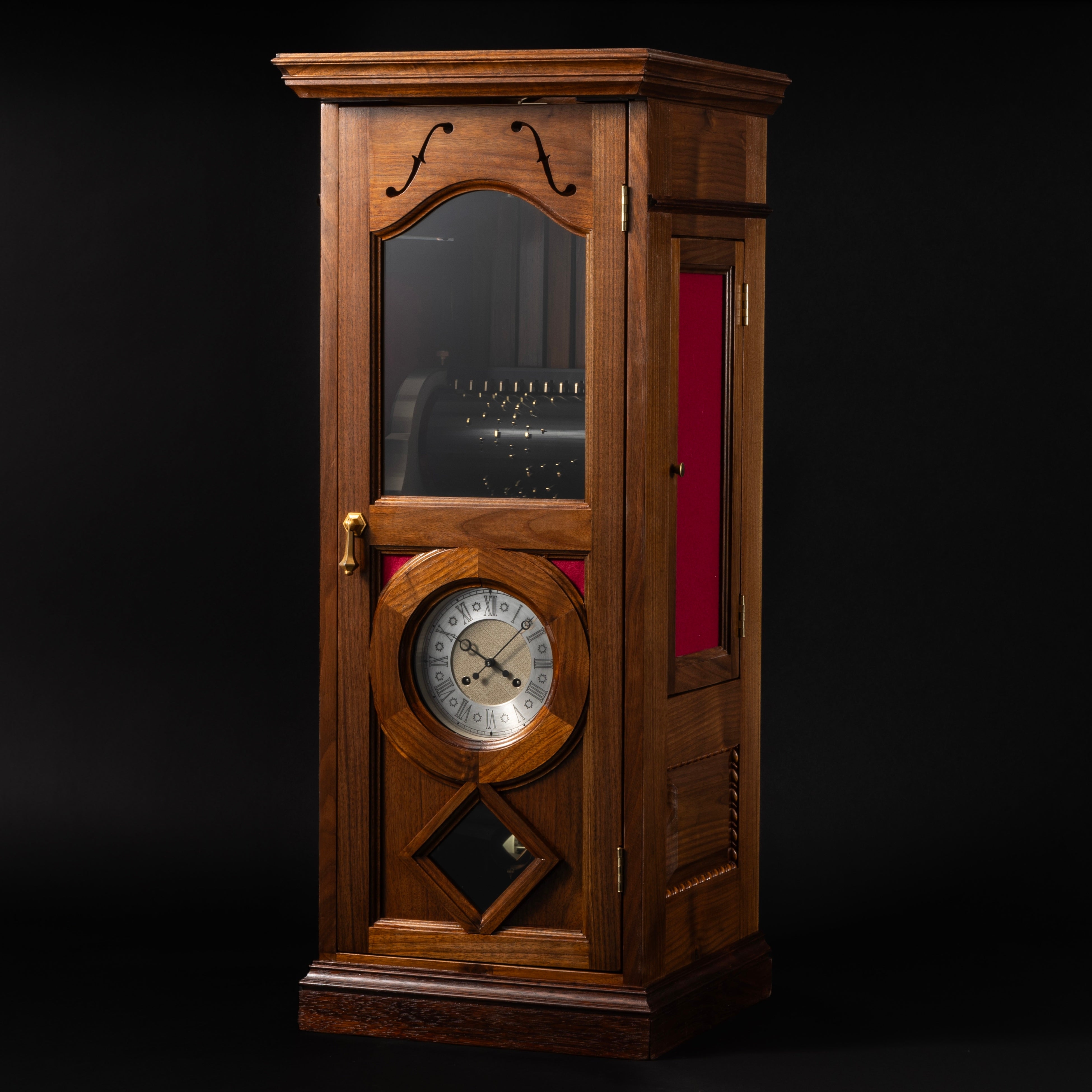 https://prcdn.freetls.fastly.net/release_image/171558/1/171558-1-35e2046182b1131d87014b5d3d3ac465-1344×1792.jpg A doll emerging from a trick box At the time of its creation, it was exhibited for regional PR purposes, events such as the Aichi Expo, and art exhibitions. It was created with the intention of having “Kugutsushi Okyodayu” manipulate the “Karakuri Box” and perform a Karakuri puppet show. “Kugutsushi Okyodayu” was later used in another work, so this time only the remaining mechanical clock part will be exhibited. Yuriko Mudo (1944-2015) Artist, Art Producer He has installed monumental Karakuri dolls around the country, based on the theme of Japanese-Western coexistence. For the 2005 World Expo, Aichi, Japan, he created the Karakuri Monument “Tower of Japan: Moon,” intended for permanent preservation. It can still be seen on site today. He has a deep knowledge of Japanese history, particularly the Owari Domain. He led a citizens’ movement to restore the Honmaru Palace of Nagoya Castle. His dolls are characterized by the beauty of his puppets, backed by his knowledge, such as the use of Nishijin textiles, and by their astonishing mechanisms. ◆Mechanical 7-segment watch Karakuristo Produced and owned in 2024 Width: 20.8 cm, height: 10.3 cm, depth: 9.5 cm