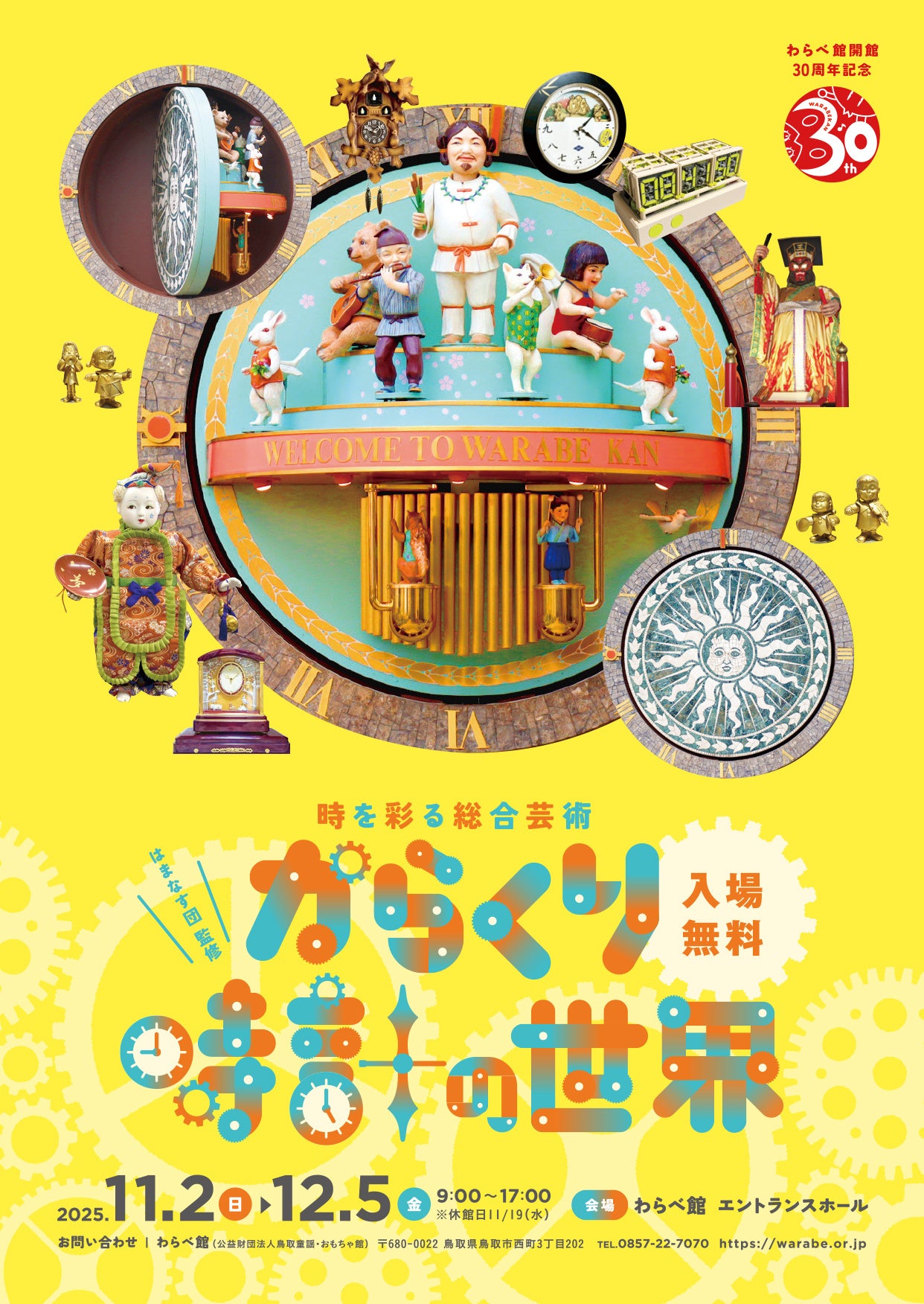 Tottori Children’s Song and Toy Museum, Public Interest Incorporated Foundation Press Release: October 17, 2025 The internet generation rediscovers the charm of mechanical clocks. Warabekan Museum celebrates its 30th anniversary with the exhibition “The World of Mechanical Clocks – Comprehensive Art Supervised by the Hamanasu-dan Group” * “Hamanasu-dan”: A unit in their 20s who are obsessed with mechanical clocks. They continue to research and study mechanical clocks across the country. To commemorate its 30th anniversary, Warabekan (Tottori City, Tottori Prefecture), a museum themed around children’s songs, folk songs, and toys, is holding a special exhibition titled “The World of Karakuri Clocks, Supervised by the Hamanasu Group.” -A Comprehensive Art that Colors Time-” The aim of the exhibition is to reaffirm the Japanese craftsmanship and cultural value of Karakuri clocks. Admission is free, and the exhibition will run for approximately one month from Sunday, November 2, 2025. Gallery talks and a mini symposium will be held during the exhibition.
