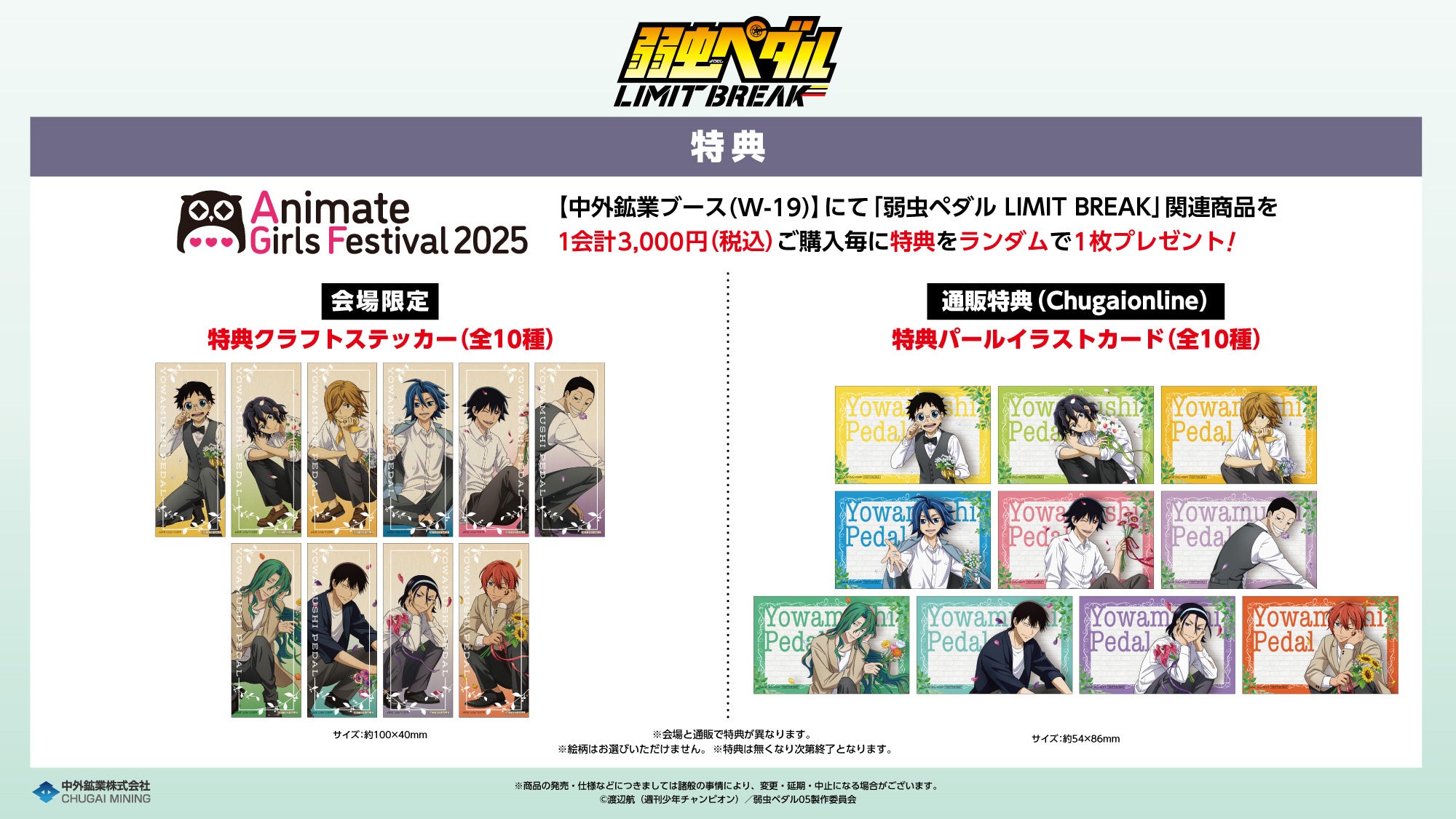 Chugai Mining Co., Ltd. Press release: October 17, 2025 To Members of the Press From “Yowamushi Pedal LIMIT BREAK,” merchandise featuring original illustrations from the third installment of the “BIRTHDAY FLOWER” series will be available at “AGF2025”! Advance sales will be held at the Chugai Mining booth [W-19]! Held at Ikebukuro Sunshine City from Saturday, November 8th to Sunday, November 9th, 2025