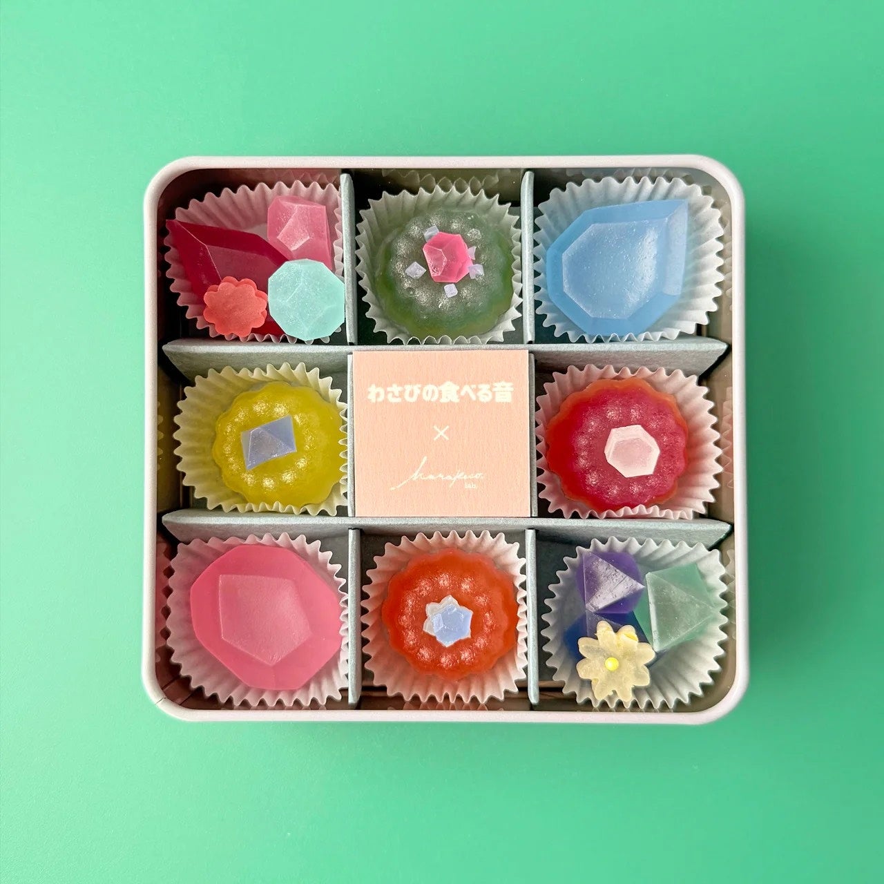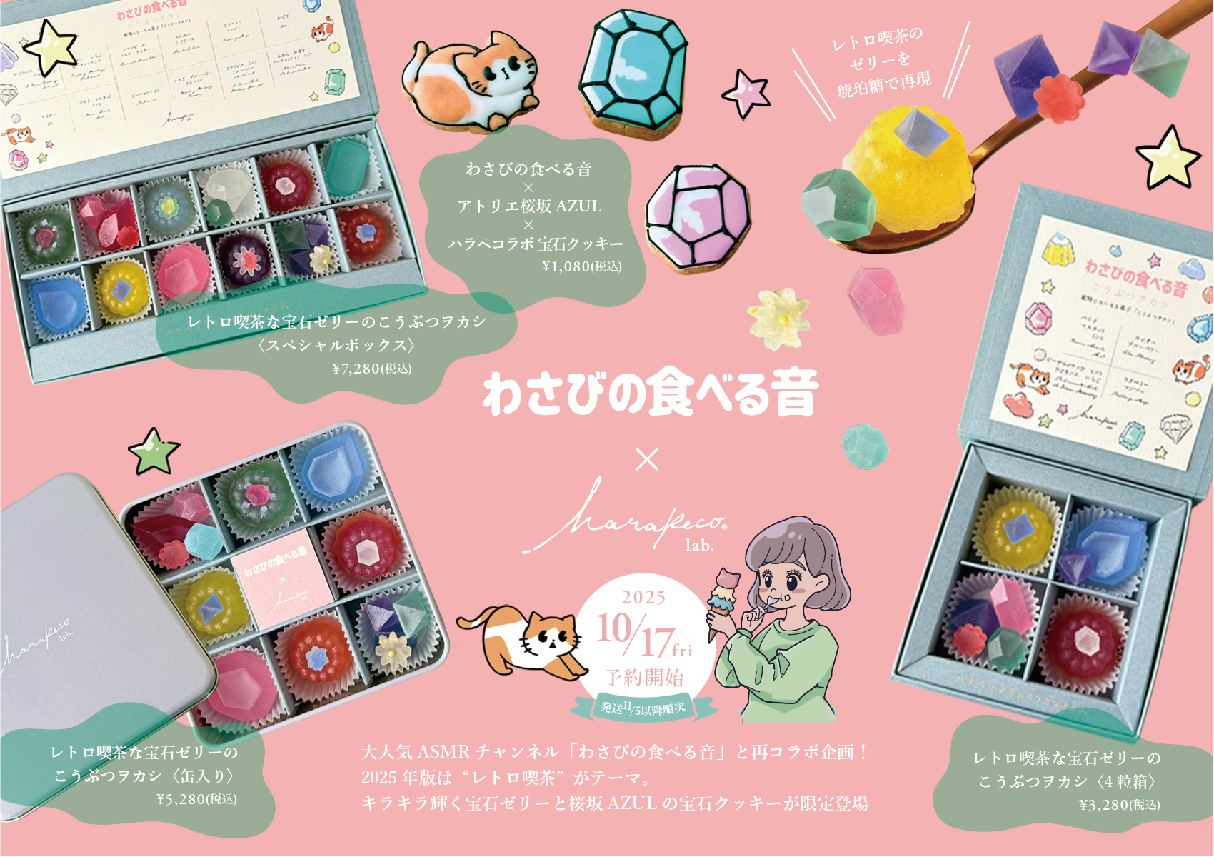 preservatives are used. This popular confectionery workshop handcrafts their sweets with the smiles of both the giver and the recipient in mind. They create original sweets packed with their attention to detail, including the “Petit Jolie” series of icing cookies, which won both the top gold award and the distribution category award at the “Fukuoka Design Awards.” Product Overview The Sound of Eating Wasabi × Harape Collaboration Retro Cafe Jewel Jelly Kobutsu Okashi (Box of 4) Price: ¥3,280 (tax included) Net Weight: 60g Box Size: Width x Height x Depth 11.5cm x 11cm x 3.5cm (external dimensions) Wasabi Eating Sounds x Harape Collaboration: Retro Cafe Jewel Jelly “Kobutsu Okashi” (Canned) Price: ¥5,280 (tax included) Net weight: 120g Box size: W x L x H 12cm x 12cm x 4.2cm (external dimensions) Wasabi no Tabe no Oto × Harape Collaboration: Retro Cafe Jewel Jelly Kobutsu Okashi (Special Box) Price: ¥7,280 (tax included) Net weight: 180g Box size: W x L x H 24.5cm x 11.5cm x 3.5cm (external dimensions) Wasabi no Tabetou x Harape Collaboration x Sakurazaka AZUL Jewel Cookie Price: ¥1,080 (tax included) Contents: 3 cookies How to purchase Sales period: Pre-orders begin at 12:00 noon on October 17, 2025. Shipments will begin sequentially from November 5th. Shipping information: Nationwide shipping, separate shipping charges apply How to purchase online: Available at the official Harape Collabo online store listed below. URL: http://harapecolab.com Pre-orders are available at the following stores. In-store pickup or shipping available from November 5th onwards. Halape Collabo Museum Shop & Cafe (Fukuoka Main Branch) Address: 1F Yoshido Heim, 1-26-7 Oike, Minami-ku, Fukuoka City, Fukuoka Prefecture, 815-0073 Business Hours: Shop & Cafe Open 11:30 – Close 17:00 (Last Order 16:30) Closed: Mondays, Sundays, and Holidays (Irregular Holidays) TEL: 092-710-1136 Instagram: