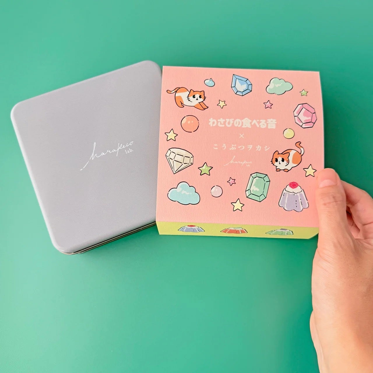 https://prcdn.freetls.fastly.net/release_image/89127/92/89127-92-e5e41fc088db082ee7f1425cd86cb364-1280×1280.jpg It’s also cute when displayed next to amber sugar! [Product Overview] Product name :Wasabi Eating Sound × Harape Collaboration Retro Cafe Jewel Jelly Kobutsu Okashi Sale Price:¥6,480 (tax included) Net Weight:380g Product Size: Tart diameter 122mm (bottom 115mm) x tart height 18mm fits animal crusts up to 3cm in height. Best before date:We will ship products with a shelf life of at least one month from the shipping date. Wasabi Tabu no Oto × Harape Collaboration Retro Cafe Jewel Jelly Kobutsu Okashi ・〈Box of 4〉 ¥3,280 (tax included) ・〈Can〉 ¥5,280 (tax included) ・〈Special Box〉 ¥7,280 (tax included) Wasabi no Tabe Oto × Harape Collaboration × Sakurazaka AZUL Jewel Cookies (3 icing cookies) ・¥1,080 (tax included) ⸻ Sales Schedule ・Pre-order Period: Friday, October 17, 2025, noon – Thursday, October 30 ・Shipping Start: Shipments will begin sequentially from Wednesday, November 5, 2025 *Due to limited quantities, orders will close once the planned number is reached. ⸻ ������ About the “Sound of Eating Wasabi” A hugely popular ASMR YouTuber with over 800,000 followers on social media. カラフルで美味しそうな琥珀糖やキャンディーを、独自の世界観とともに届けています。 これまでにもハラペコラボのスイーツを多数ご紹介いただいており、見ているだけで心がときめく映像が魅力。