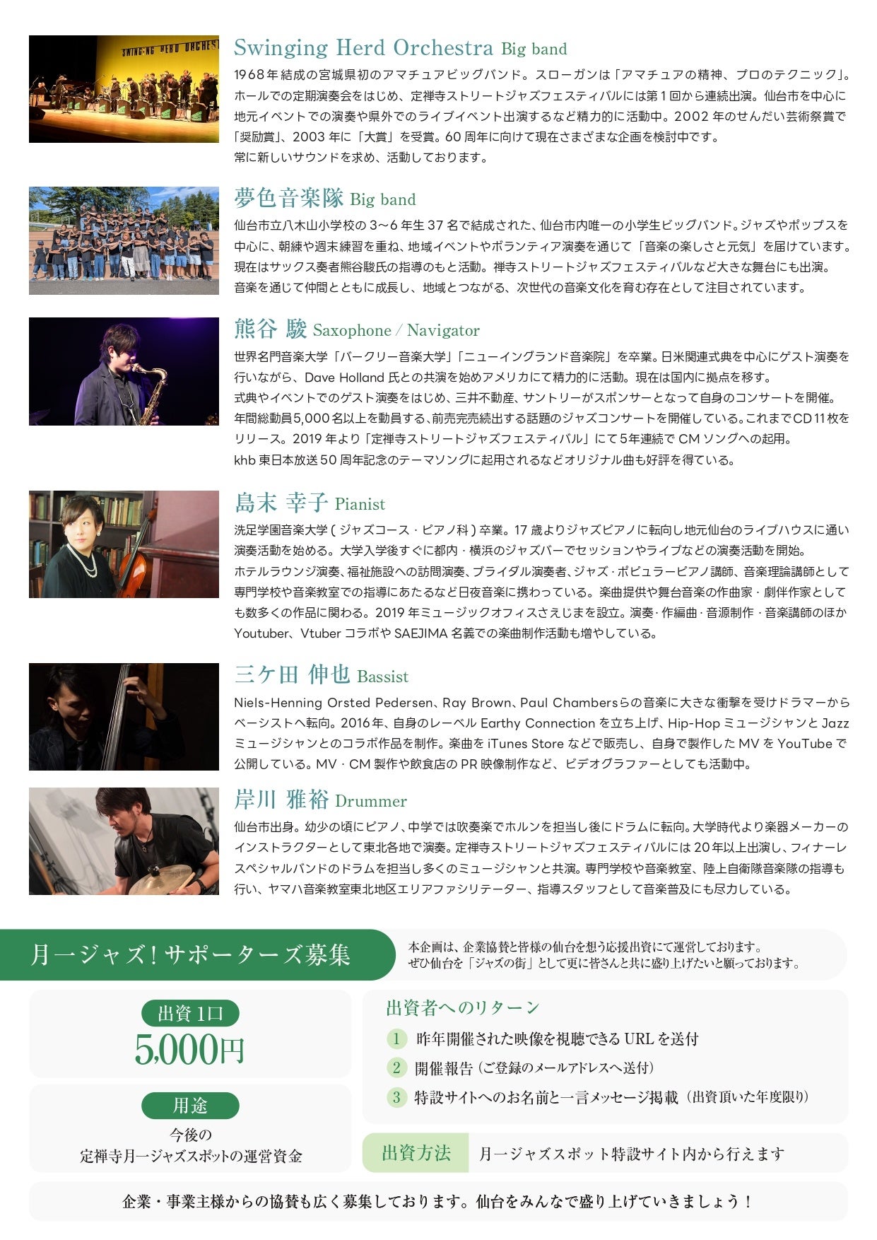 (Saxophone/Navigator) Sachiko Shimasue (Piano)/Shinya Mikata (Bass)/Masahiro Kishikawa (Drums) ■Sponsorship Sponsors: Miyagi Prefecture / Sendai City / Sendai Association of Corporate Executives / Tohoku Tourism Promotion Organization / Jozenji Street Jazz Festival Association / Jozenji-dori Area Management Sponsors: Mitsui Fudosan Co., Ltd., Suntory Limited, Fujisaki Co., Ltd., Fukamatsugumi Co., Ltd., Kanesa Fujiwaraya Co., Ltd., JR East Tohoku Sogo Service Co., Ltd., Sendai Kyoritsu Co., Ltd., Vapwind Co., Ltd. (in no particular order) ■Special website and information links Special