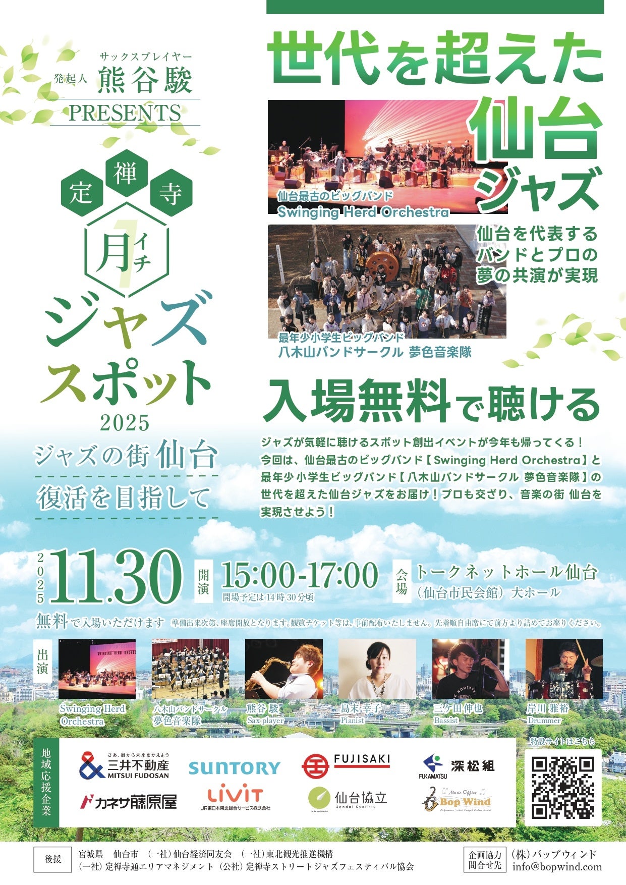 Vapwind Inc. Press Release: October 20, 2025 Sendai jazz resonates across generations — “Jozenji Monthly Jazz Spot 2025” special performance to be held on Sunday, November 30th Sendai’s oldest big band and its youngest elementary school big band will perform together on a special stage, playing the future of Sendai, the city of music. ■The current state of Sendai jazz, connecting across generations