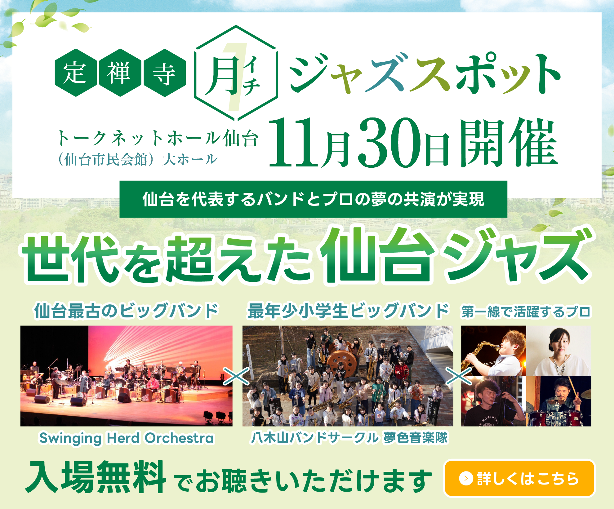 https://prcdn.freetls.fastly.net/release_image/74291/23/74291-23-1c103fd7d578076443abd12f24440779-1241×1754.jpg Performance Title: Jozenji Monthly Jazz Spot 2025 – Sendai Jazz Across Generations – Date and Time: Sunday, November 30, 2025 Doors open at 2:30 PM / Show begins at 3:00 PM / Scheduled end at 5:00 PM Venue: Talk Net Hall Sendai (Sendai Civic Hall) Main Hall (4-1 Sakuragaoka Park, Aoba-ku, Sendai, 980-0823) Admission Fee: Free (Unreserved seating, first-come, first-served) Performers: Swinging Herd Orchestra Yagiyama Band Circle Yumeiro Ongakutai Shun Kumagai