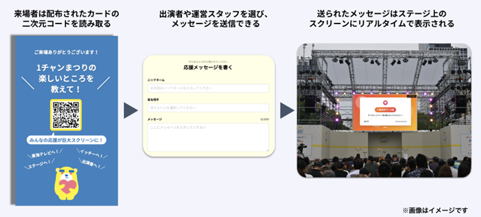■Introduction background At Tokai TV, we strive to create an environment where every employee can feel proud and fulfilled in their work. While opportunities to hear from viewers are limited in the course of their daily work, we have developed a new system that allows employees to truly feel that their work contributes to someone’s joy. As part of this initiative, we introduced “Chipee” to the Tokai TV 1-chan Festival, an annual all-employee event where programs and performers interact with local residents. By conveying the “thank you” and “support” of attendees, employees feel a connection with viewers, which increases their motivation and job satisfaction. [Comment from Reijiro Yamazaki, CEO, Chippy Co., Ltd.] Chippy Co., Ltd. aims to “foster connections between people and companies through the power of empathy.” We use the power of digital technology to make previously inexpressible thoughts and invisible emotions visible, helping to build relationships where people can feel each other’s presence and feelings. We are pleased that Tokai Television will be using our system for their “1 Channel Festival,” allowing our employees to directly feel the gratitude and support they receive from viewers. We hope that by sharing our mutual passions, Tokai TV employees and viewers will be able to create unprecedented programming and viewing experiences, further deepening our ties with the local community. ■ How to use in “1chan Matsuri” Attendees can access “Thank You Cards*” with QR codes distributed at the venue and send messages of gratitude and support to employees and performers. The messages will be displayed on the large screen on stage and on the event’s special website, allowing employees to receive the visitors’ thoughts. ★Tokai TV 1 Channel Festival Special Page: https://www.tokai-tv.com/1chfes/ *Thank you cards: Business card-sized cards with QR codes handed directly to attendees by Tokai TV employees. By scanning the QR code, attendees will be taken to a dedicated page where they can freely send messages of thanks and support.