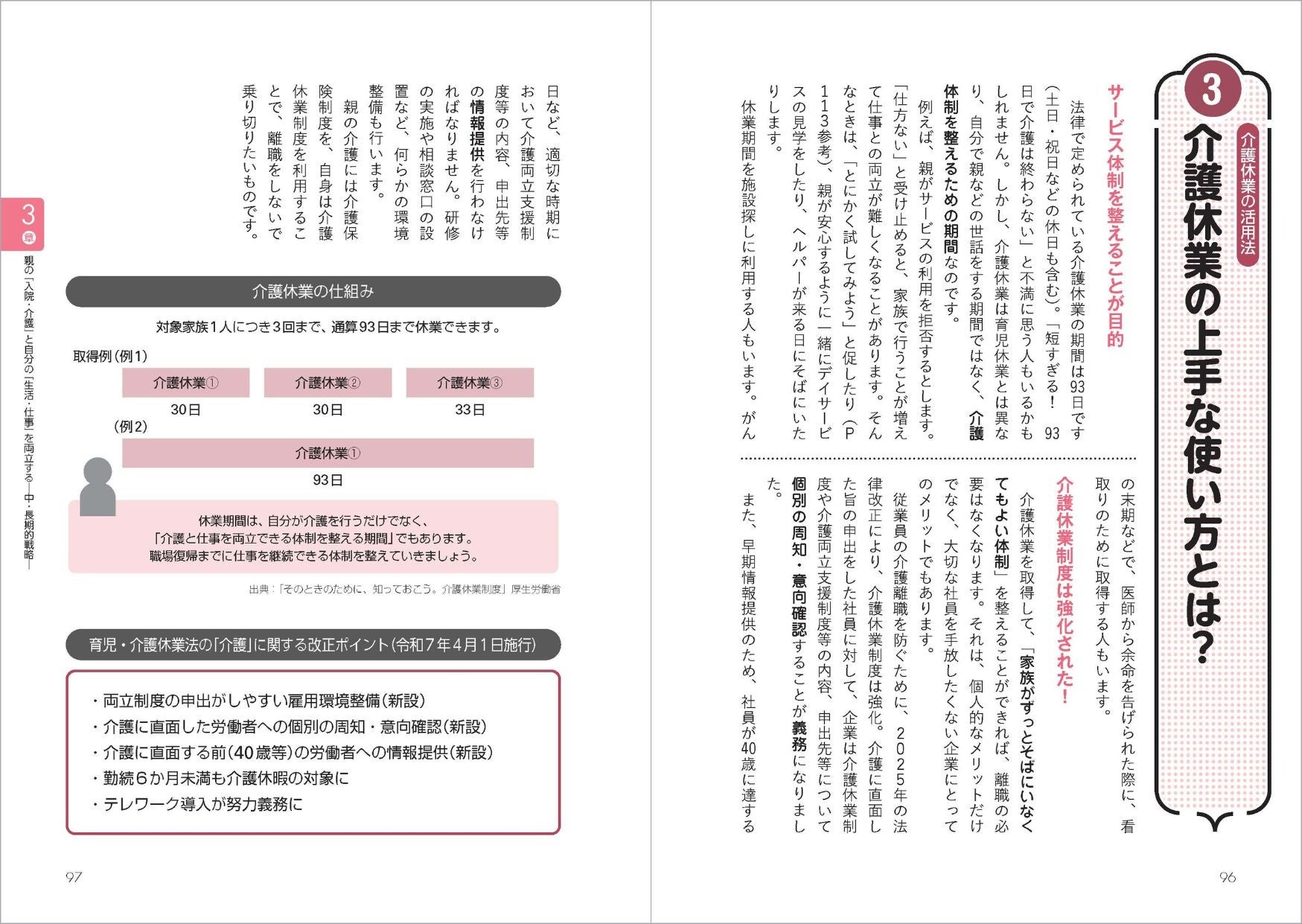 “caregiving” – Medium-term strategy – 1: I don’t know anything about caregiving. Where can I get advice? 2. What is the difference between a “primary caregiver” and a “key person”? 3. How is “need for nursing care” certified? 4. What is the “Basic Checklist”? 5: What does the “certification survey” for long-term care insurance involve? 6: This “level of care required” is impossible in this condition! 7: Who plans my long-term care services? 8: What kind of person is a good “care manager”? 9: What kind of “nursing care services” are available? 10: How much do nursing care insurance services cost? 11: How can I get a doctor or nurse to come to my home? 12: I just need help with housework and nursing care! 13: What can I ask a home helper to do? 14: How do I use the “Day Care/Overnight Stay” service? 15: Are there any homes that offer “Day Care,” “Overnight Stay,” or “Visits”? 16: My parents’ house is full of steps, so I’m worried about falling! 17: I want to use a nursing bed, wheelchair, and handrails. 18: Are there any services I can use other than nursing care insurance? 19: I can’t go to my parents’ house to prepare meals! 20: Emergency calls and disposable diaper distribution will also be available as municipal services 21: How can I keep an eye on my parents who live alone every day? Column: Starting in 2026. What is the “Long-Term Care Information Infrastructure”? Chapter 3: Balancing a parent’s hospitalization and caregiving with your own life and work – Medium- to long-term strategies – 1: Can I provide caregiving without quitting my job? 2: Are there laws allowing me to take time off work to care for a family member? 3: How should I use my family care leave effectively? 4: What kind of money can I receive if I take time off work to care for a family member? 5: I’m confused by my care manager’s lack of
