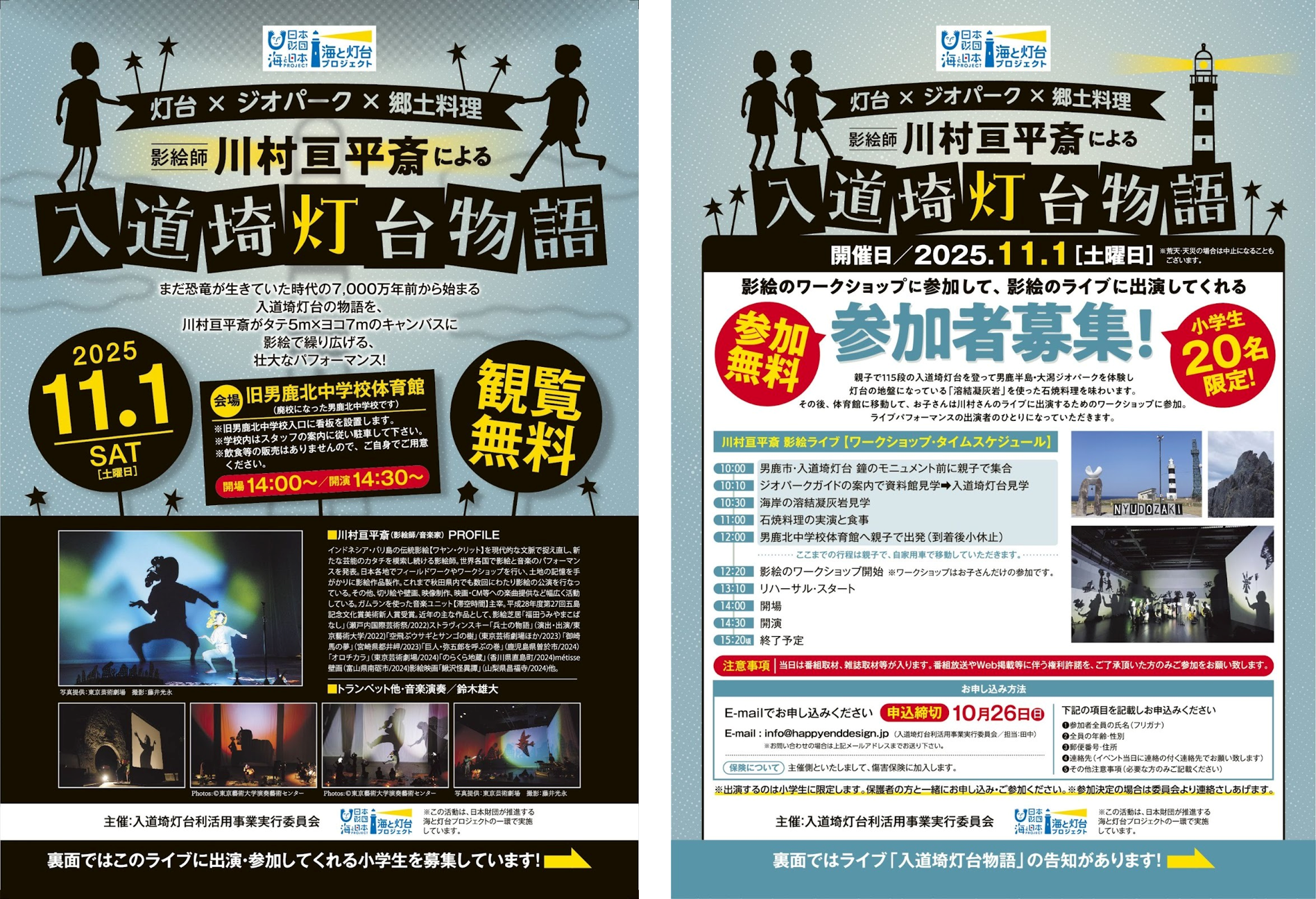 Social Action Network Press release: October 20, 2025 To Members of the Press “Lighting up 70 million years of memories” Nyudozaki Lighthouse Shadow Play Performance: Shadow play artist Kohei Kawamura will be performing “The Story of Nyudozaki Lighthouse”! Saturday, November 1, 2025 14:00-16:00 Location/Former Oga Kita Junior High School Gymnasium Kitaura, Oga City The Nyudosaki Lighthouse