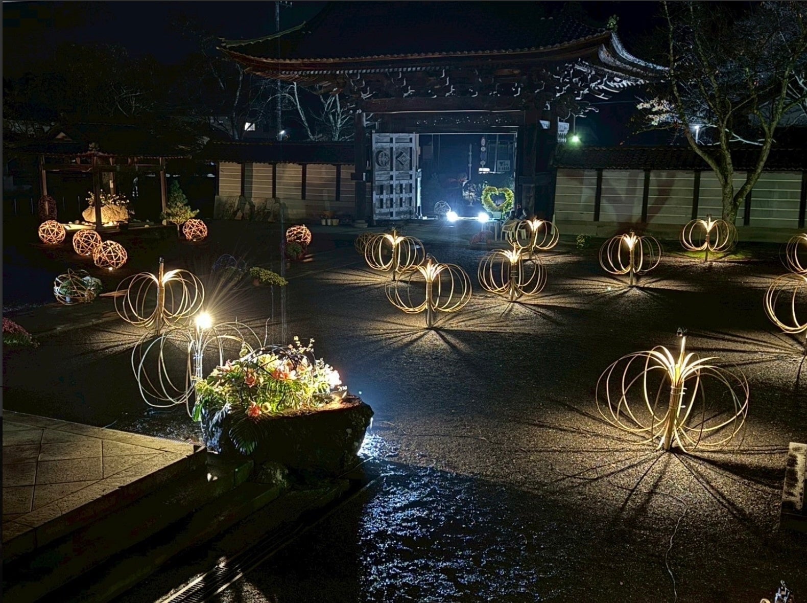 arrangements – “Takehana Akari” “Takehana Akari,” an installation weaving fantastical light and flowers, will add color to the temple opening. The bamboo lanterns are crafted by local bamboo fence artisan “Takenosuke” Daisuke Kataoka. The bamboo he meticulously polishes creates soft light and shadow within the temple grounds, evoking a mysterious world. Furthermore, world-renowned flower artist “KAZU” Showa Naito skillfully combines vines, branches, and leaves to express the beauty of Japanese culture. “Takebana Akari,” a collaborative work created by these two masters, is a mystical space where bamboo and flowers resonate with each other, igniting a quiet sense of emotion in the hearts of all who visit.