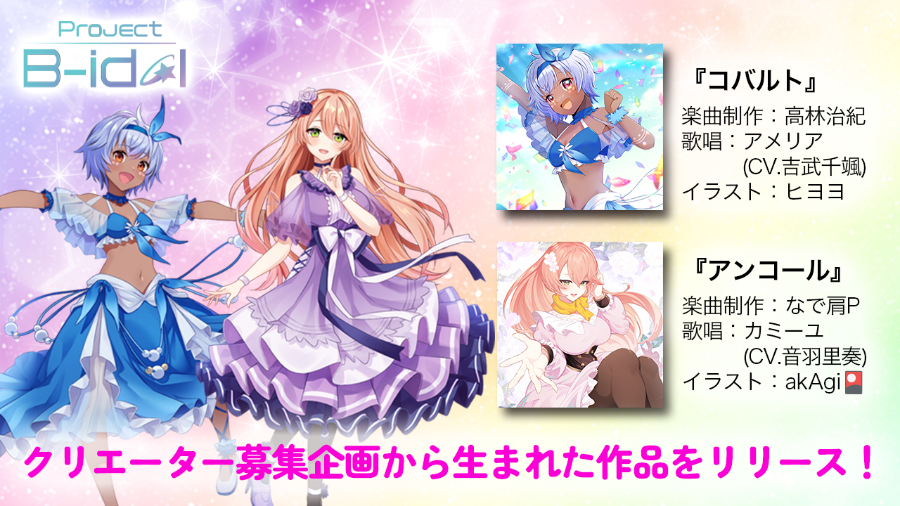 https://prcdn.freetls.fastly.net/release_image/171029/1/171029-1-cb586849fd0d9a8d7b69a5a81f62feab-1333×2000.jpg Chihaya Yoshitake (role of Amelia) Amelia’s new song! First of all, I’m so happy!! I think it’s a refreshing and vibrant song that suits Amelia’s color, cobalt blue. I hope you enjoy watching him move forward straight towards his dreams♪ Ken Iijima “Encore” is a delicate, gorgeous, and dynamic song, like a scene from Broadway. Otoha’s rich expressiveness and Sloped Shoulder P’s meticulous arrangement are truly stunning, and the mix was carefully crafted to ensure each and every note stands out. I’d be delighted if I could picture Camille singing with a big band behind her. “Cobalt” is an exhilarating rock number that brings to mind a piercing blue sky. Yoshitake’s cute and powerful vocals are a perfect match for the lyrics and arrangement, which exude forward-moving energy. Although it sounds simple, the phrasing and breathing are actually quite difficult, so we asked for a mix that would bring out the energy of the band sound. 【Release Schedule】 October 26th: CD pre-sale at the music event “M3” October 27th: “Encore” begins distribution on various music streaming services “Cobalt” will be available on various music streaming services in late November (details to be announced at a later date) The CD will also be available for purchase at the official online store, “B-idol SHOP.” https://b-idol.booth.pm/ The Value of a Participatory Production Model Project B-idol proposes a new creative cycle in which “general creators participate in the production of official IP and create works together with professionals.” This aims to create a mutually beneficial structure: creators can gain achievements that will remain in their portfolios, and IP management can expand their passion and creative base through fan participation. We aim for this model to become a new example of “participatory IP development” in the entertainment industry going forward. What is Project B-idol