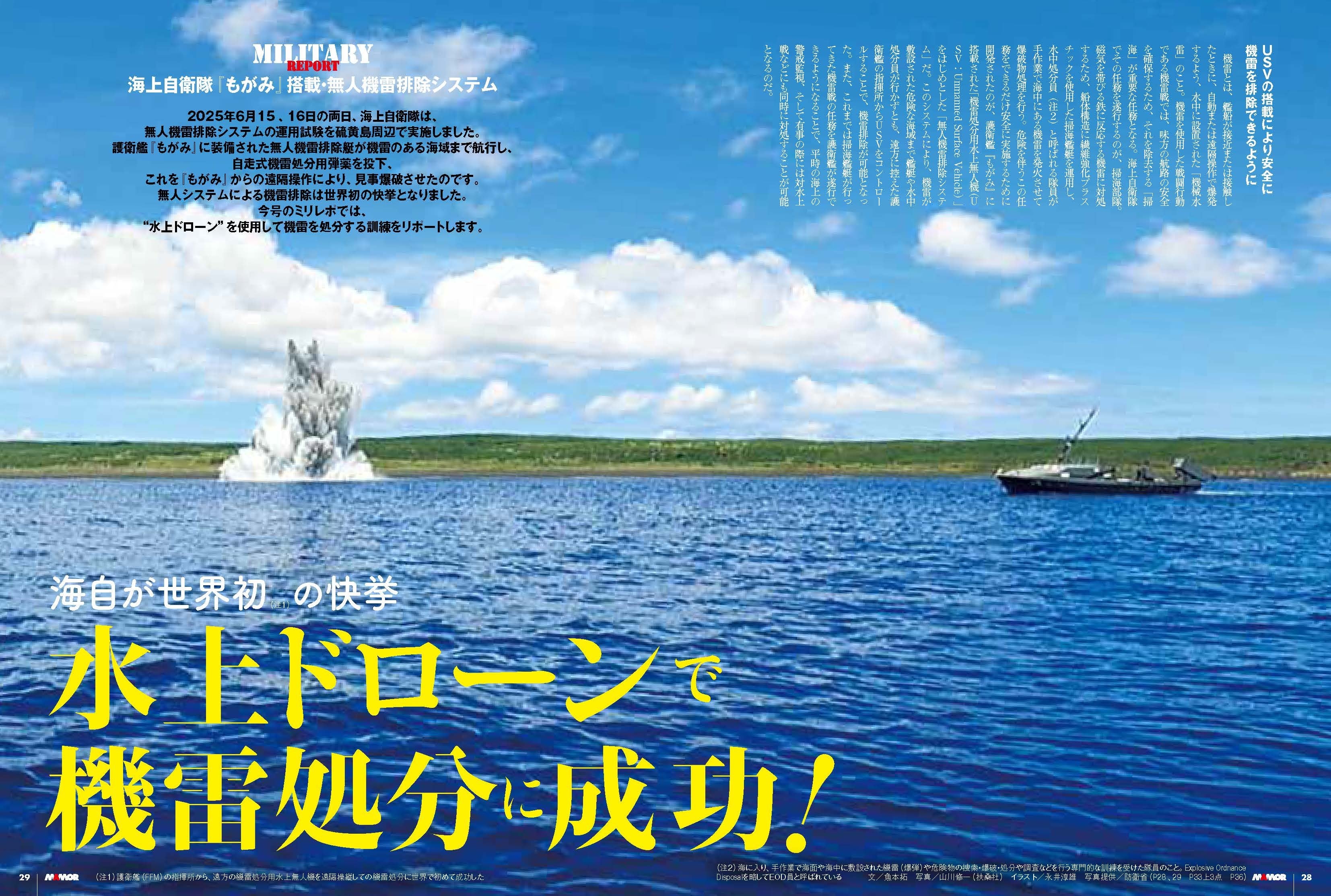 https://prcdn.freetls.fastly.net/release_image/26633/1465/26633-1465-31c27e1d798f96c7a54d824d8b90c912-3308×2229.jpg On June 15 and 16, 2025, the Japan Maritime Self-Defense Force conducted operational tests of an unmanned mine-clearance system near Iwo Jima. An unmanned mine-clearance boat equipped on the destroyer Mogami navigated to the area containing the mines and dropped a self-propelled mine-clearance munition, which was then remotely controlled from the Mogami and successfully detonated. This was a world first* for mine clearance using an unmanned system. In this issue of Military Report, we will report on training to dispose of mines using a “surface drone.” *This marks the world’s first successful mine disposal operation using a remotely controlled surface drone for mine disposal from the command post of a destroyer (FFM). This Month’s Cover & Goddess of the Defenders: Shimoiya Yukiho