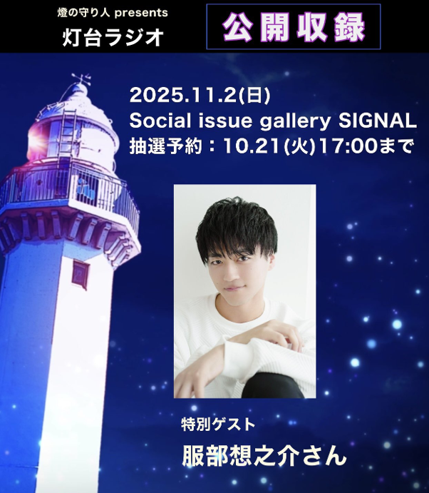 https://prcdn.freetls.fastly.net/release_image/86409/89/86409-89-16f9098751ba8ae84a71d6e32c57abd7-602×691.png 《Event Overview》 Public Recording of “Tono no Moribito presents Lighthouse Radio” Date and Time: Sunday, November 2, 2025, 2:30 PM – 4:00 PM Admission: Free (please order one drink or one parfait) Venue: Social Issue Gallery SIGNAL Guest: Hattori Sounosuke (Nagaoka Kanaya, Fantasy Night Stories Series) Hikaru Takada (Producer of “Guardian of the Light”) Kata (Scriptwriter for The Guardian of the Light) ・How to participate: Lottery reservation system (deadline: 5:00 PM on Tuesday, October 21st, winners announced on Wednesday, October 22nd) ・Lottery application form: