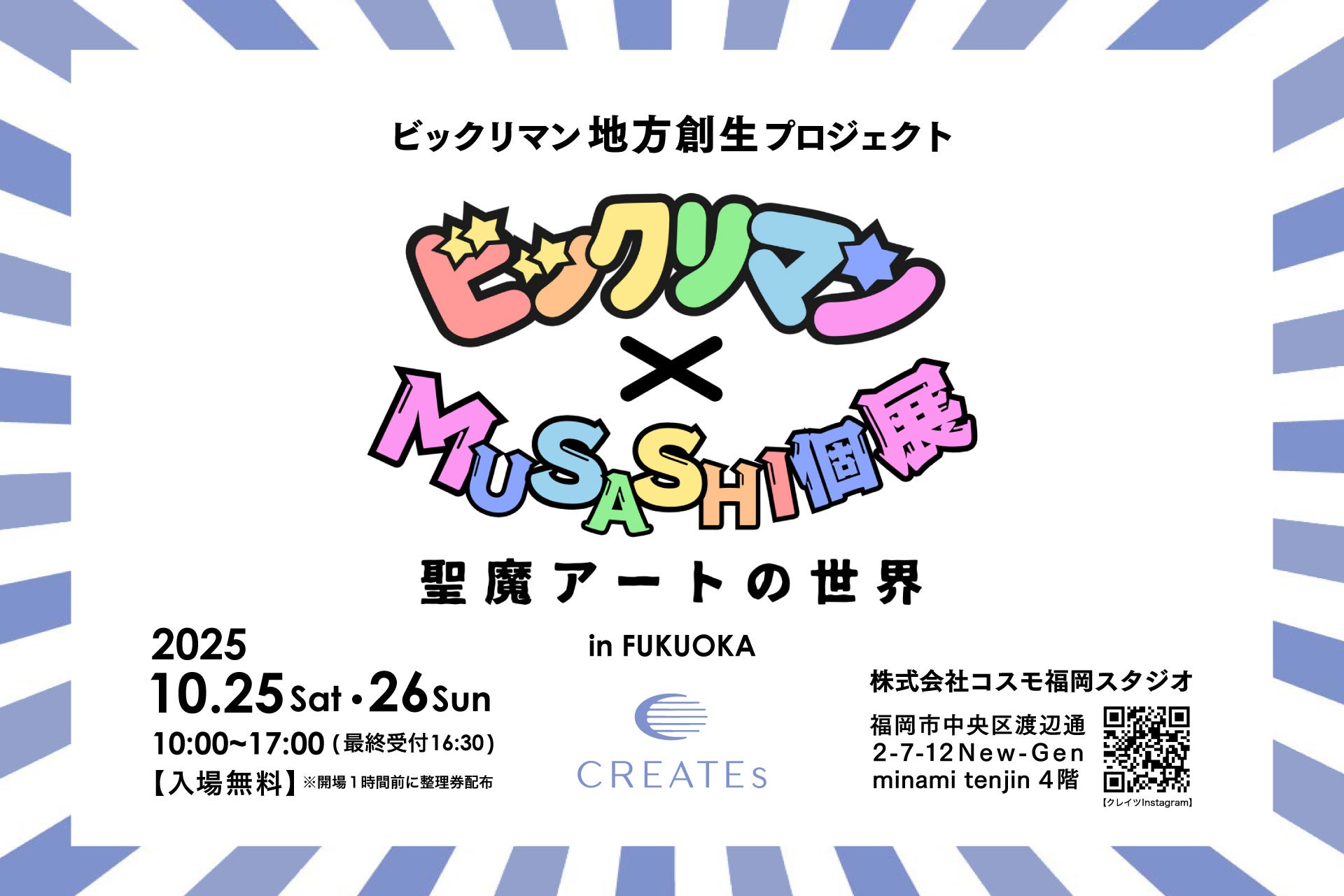 three-dimensional sculptures since childhood, and began painting seriously in junior high school. His style is characterized by his skillful use of markers, acrylics, and face paints to create colorful works and characters. His skills and style of incorporating works born from beats and lyrics, and floral patterns into canvases, digital art, and three-dimensional sculptures, are attracting attention. Instagram: @musashi_ishitomi “Bikkuriman x MUSASHI ~The World of Holy Demonic Art~” Part 3 Fukuoka • Date: October 25th (Sat) and 26th (Sun), 2025 • Holding time: 10:00-17:00 (last reception 16:30) • Venue: Cosmo Fukuoka Studio Co., Ltd. • Address: New-Gen minami tenjin 4th floor, 2-7-12 Watanabe-dori, Chuo-ku, Fukuoka-shi, Fukuoka • Access: 2-minute walk from Nishitetsu Yakuin Station or 4-minute walk from Watanabedori Subway Station • MAP: https://maps.app.goo.gl/ZRPHT5tRCdKv2RJA8 • Co-hosted by: Lotte Co., Ltd. / Ishitomi Property Co., Ltd. • Sponsored by: Crates Co., Ltd. *Numbered tickets will be distributed one hour before the doors open. *The event time and ticket