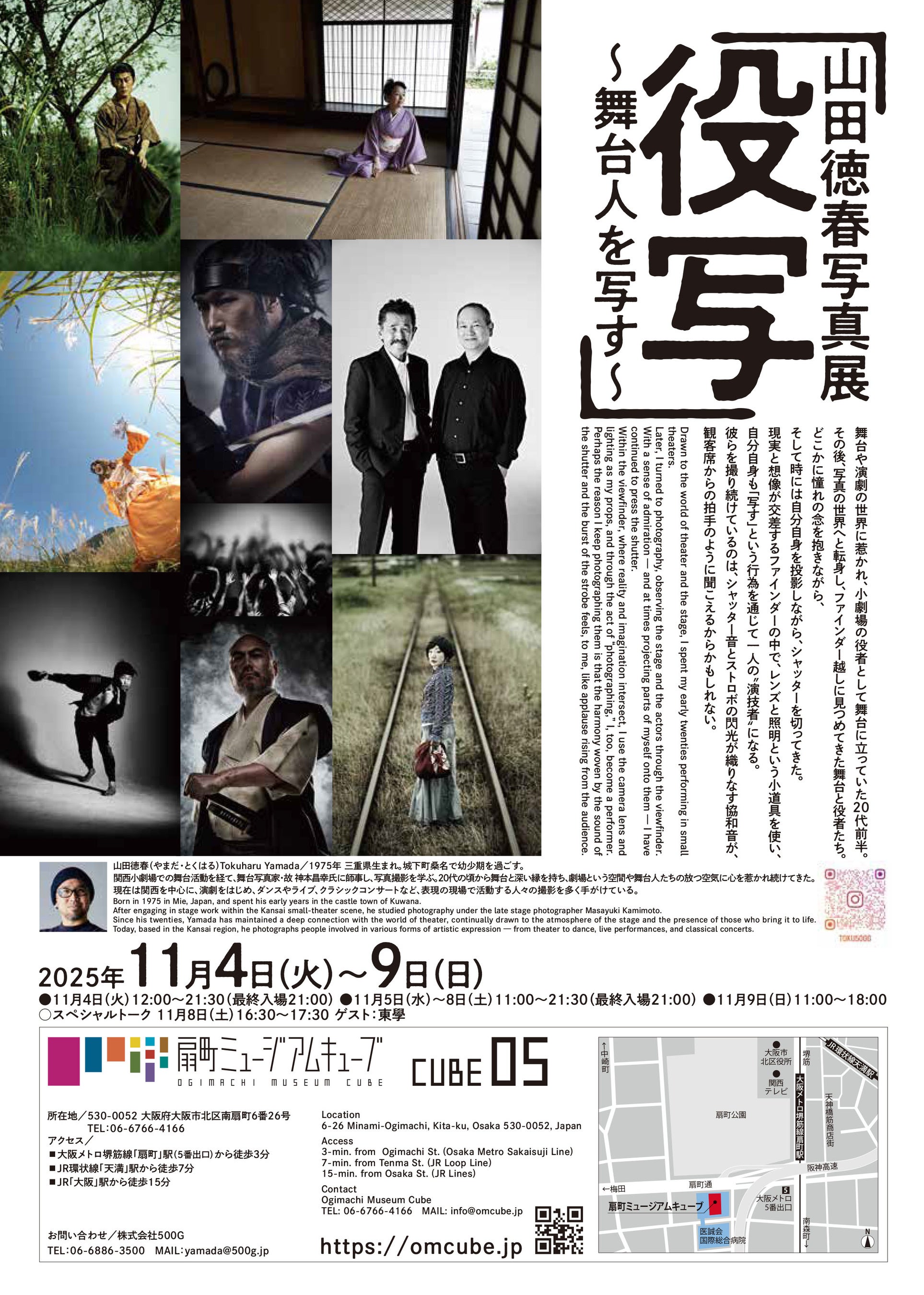 https://prcdn.freetls.fastly.net/release_image/130644/5/130644-5-38d139be8c0914320251607efbc21871-1927×2700.jpg Flyer design: Manabu Azuma (188) [Event Overview] Tokuharu Yamada Photo Exhibition “Yakusha” ~Portraits of Stage Actors~ ������ Event details page (https://omcube.jp/event/8620/) Dates: November 4th (Tuesday) – November 9th (Sunday), 2025 Venue: Ogimachi Museum Cube CUBE05 (6-26 Minami-Ogimachi, Kita-ku, Osaka City, Osaka Prefecture 530-0052) Access: ・3-minute walk from Ogimachi Station (Exit 5) on the Osaka Metro Sakaisuji Line ・7-minute walk from Tenma Station on the JR Loop Line ・15-minute walk from Osaka Station on the JR Lines https://omcube.jp/ Talk Event: Saturday, November 8th, 4:30 PM – 5:30 PM (Guest: Azuma Manabu) Contact: 500G Co., Ltd. 06-6886-3500 For more information about this release