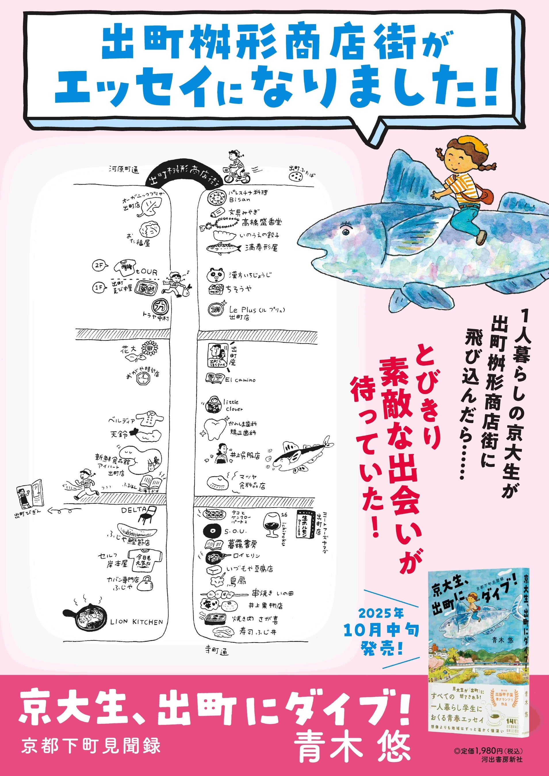 https://prcdn.freetls.fastly.net/release_image/12754/1034/12754-1034-499008bed7cb693c2fc3967fd0739fc3-1620×2467.jpg Book title: Kyoto University students dive into Demachi! Kyoto Shitamachi Travelogue Author: Aoki Yu Design: Albireo Illustration: Ichiro Specifications: 46-size / Paperback / 236 pages Release date: October 21, 2025 Price including tax: ¥1,980 (¥1,800 base price) ISBN: 978-4-309-03232-0 URL: https://www.kawade.co.jp/np/isbn/9784309032320/ *There are no plans to publish an e-book. ●What is Publishing Koshien?