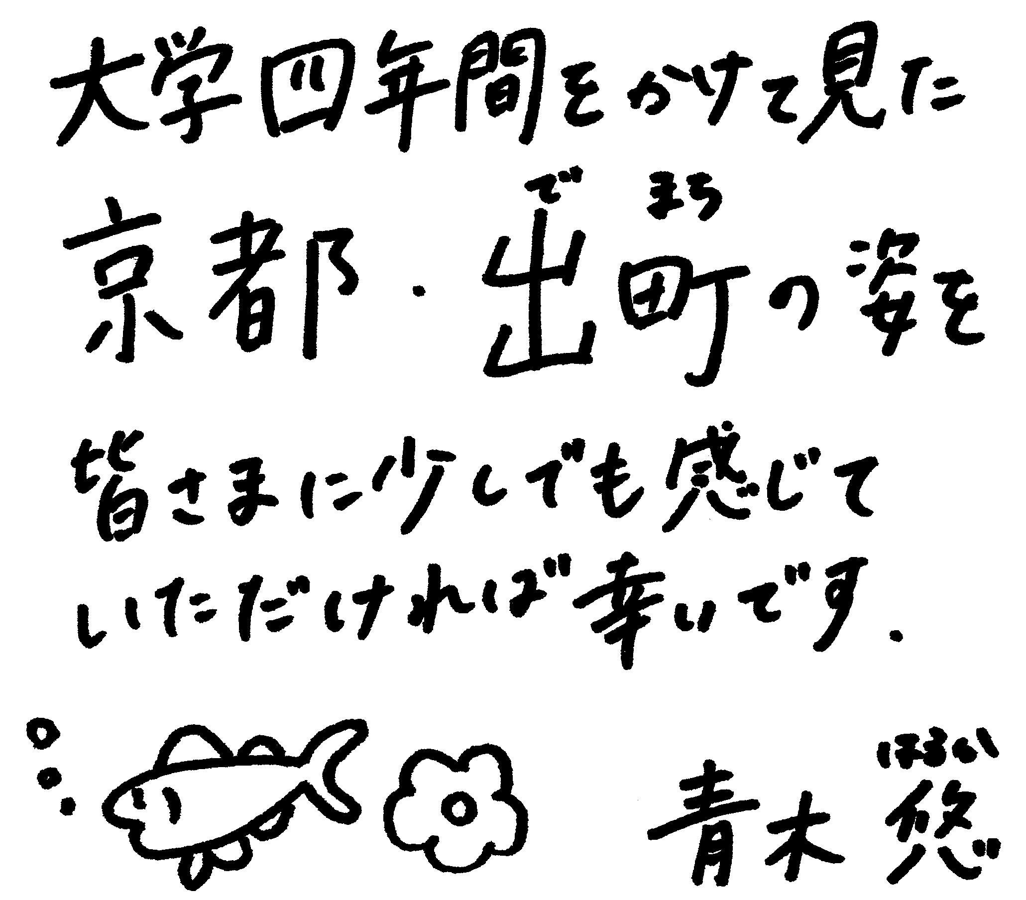 URL: https://prcdn.freetls.fastly.net/release_image/12754/1034/12754-1034-3c40499bf38e60a3b148bb47223fd2be-1822×960.jpg “Kyoto University Student Dives into Demachi! Kyoto Shitamachi Travelogue” is a coming-of-age essay written by a current Kyoto University student, depicting the “real” image of Kyoto’s downtown through his interactions with the town and its people. Set in the Demachi Masugata Shopping Arcade, where bustle and tranquility coexist, this book is filled with laughter, tears, and sudden encounters and partings… Woven from a gentle, observant eye, these essays are as dramatic as a novel, yet as realistic as a documentary. With every turn of the page, you’ll feel as if you’re there, immersed in the nostalgic air and scents of Kyoto’s downtown. Author Aoki Yu’s fresh sensibility and sincere gaze capture “Kyoto at this very moment,” a story sure to bring a gentle breath of fresh air to the reader’s heart. This book won the runner-up prize at the “Publishing Koshien,” a competition in which university students from all over Japan compete for the grand prize. This is Yu Aoki’s publishing debut, and his talent was recognized by judges Takuya Kawamura of QuizKnock and Hideaki Tsuchie (Diamond Inc.), the head judge. ● “Kyoto University Students Dive into Demachi! Comments of support from celebrities and publishing professionals for “Kyoto Shitamachi Monogatari” I commended the author for his excellent sense of balance in depicting the niche area of Demachi while maintaining the purpose of serving as a local community, without coming across as preachy. 〉 QuizKnock’s Takuya Kawamura 〈It has the refreshing feel of a coming-of-age novel set in Kyoto, but also a layered feel that connects the past and present, something even locals are surprisingly unaware of. Even though it’s a story set right in the heart of where I was born and raised, it leaves you wondering, “Where is this story from?” An exquisite blend of “Demachi and the author’s writing skills” Mishima Kunihiro, CEO of Mishimasha (from Kamigyo Ward, Kyoto City) 〈Although it’s nonfiction, I felt it had the appeal of a novel. Especially listening to the characters’ stories, I felt it had the potential to become a drama. > “Publishing Koshien” Head Judge, Tsuchie Hideaki (Diamond Inc.) Viva “Demachi Masugata Shopping Street”! Ah, here it is. A place that’s more Kyoto University-like than Kyoto University itself. I’ll never forget it, no matter how much time passes. This is true sanctuary. 〉 Takashi Yamashita, Shop Lune, Kyoto University Co-op 〈These stories are filled with powerful episodes and characters, like stories, that will make you say, “No way!?” I’m captivated not only by the mysterious power of the place called Demachi, but also by Aoki’s vitality, which draws these stories to her. This book will make you excited about undiscovered